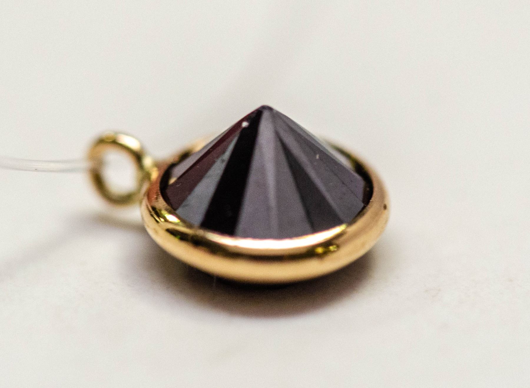 PENDANT. SUSPENDED FROM A FILAMENT NECKLACE WITH A 14 KARAT YELLOW GOLD CLASP. THE BEZEL SET ROUND BRILLIANT CUT FANCY COLORED BLACK DIAMOND. (MEASURES 6.00 X 4.41 MM, HUE BLACK LABORATORY COLOR ENHANCED, CLARITY OPAQUE. THE BLACK DIAMONDWEIGHS 1.00 CARATS) COMES WITH CERTIFICATE OF APPRAISAL FROM LOCAL APPRAISER, SUGGESTED INSURANCE COVERAGE $600.00. JEWELLERY