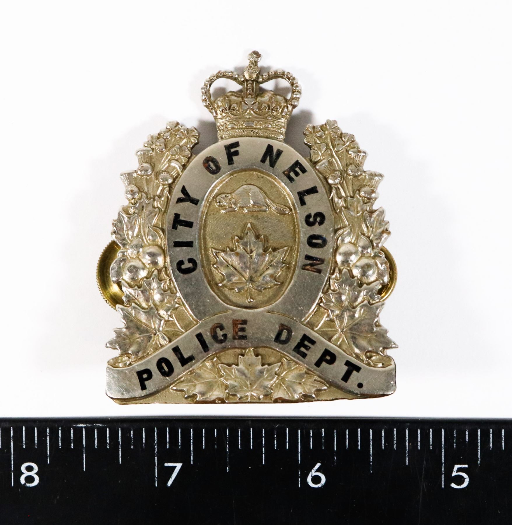 CITY OF NELSON POLICE DEPARTMENT VINTAGE BADGE CAP BADGE CANADA CANADIAN POLICE LAW ENFORCEMENT INSIGNIA W.SCULLY MARKED ON REVERSE QUEEN ELIZABETH II CROWN QEII