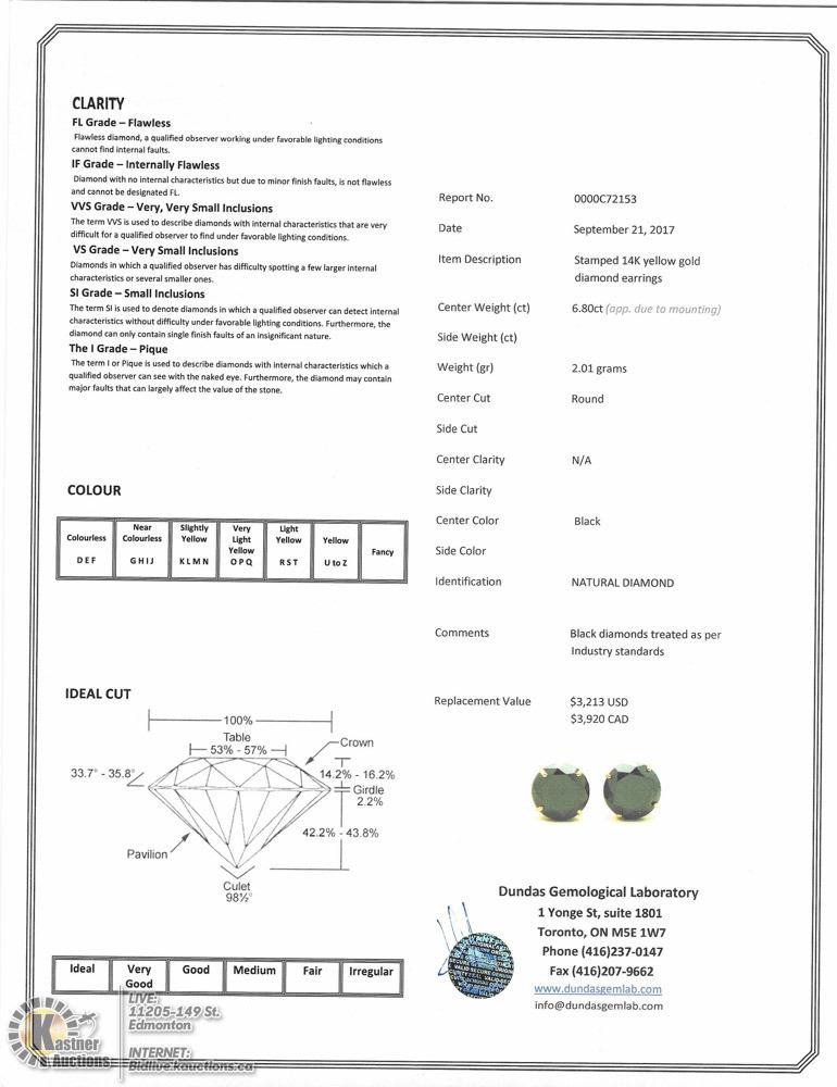 9 - MM86 - 14KT YELLOW GOLD BLACK DIAMOND EARRINGS W/COA. SUGGESTED REPLACEMENT VALUE $3920.00. JEWELLERY