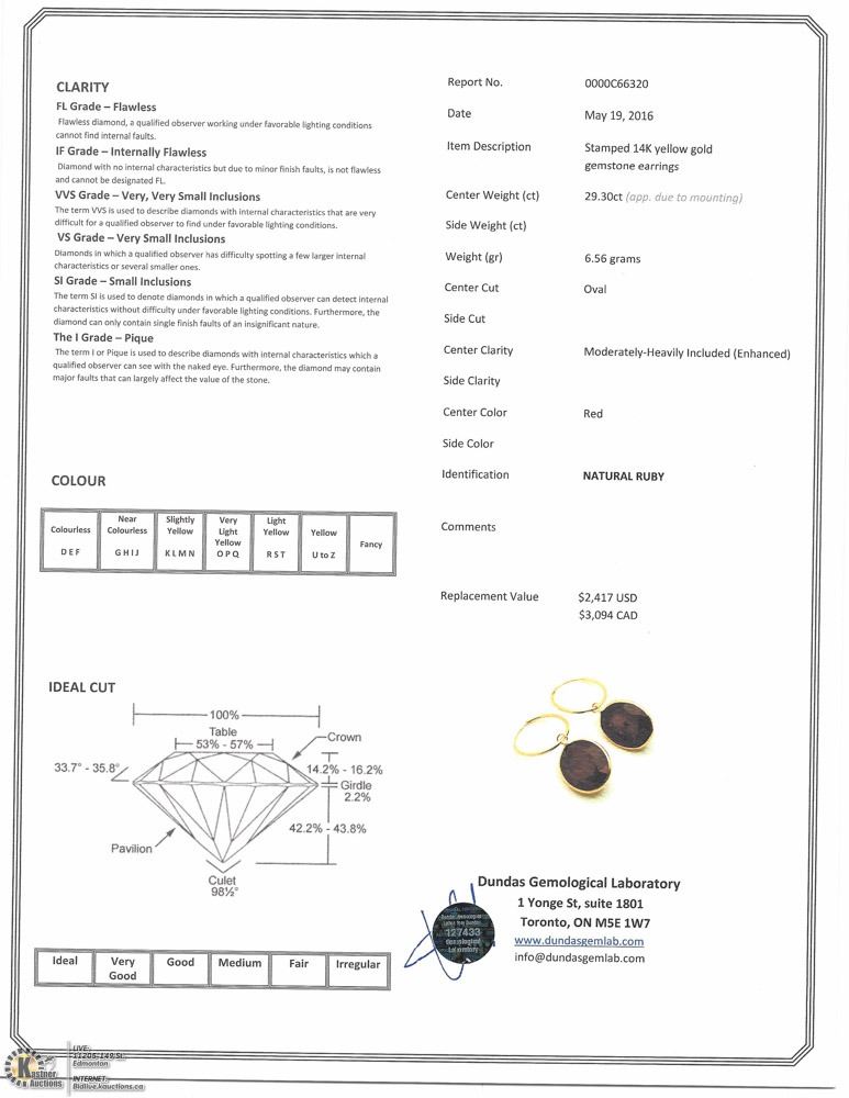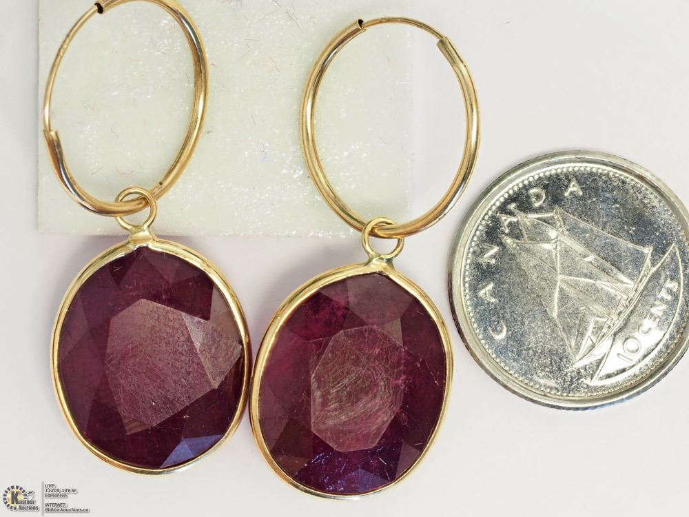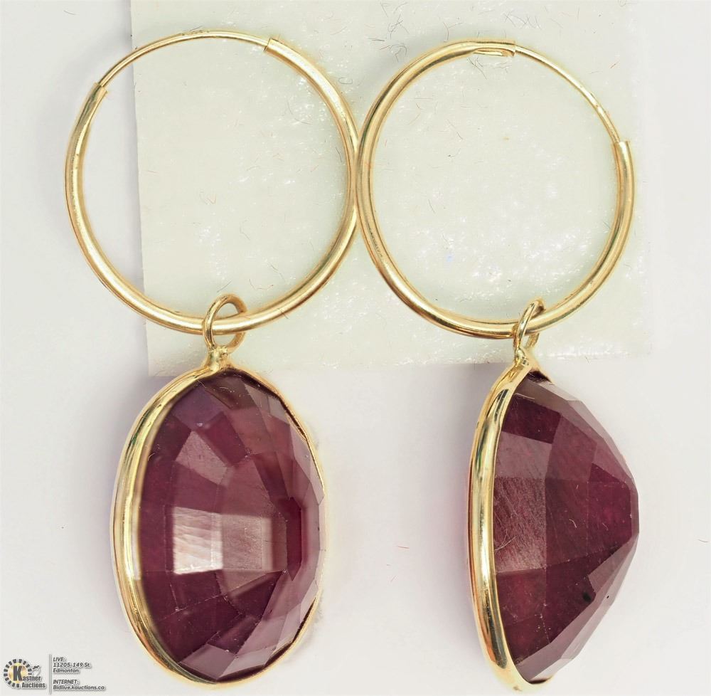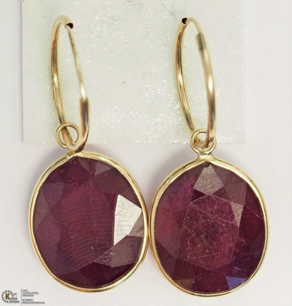 09 - GS55 - 14KT YELLOW GOLD RUBY(29.30CT) HOOP EARRINGS W/COA. SUGGESTED REPLACEMENT VALUE $3,094.00