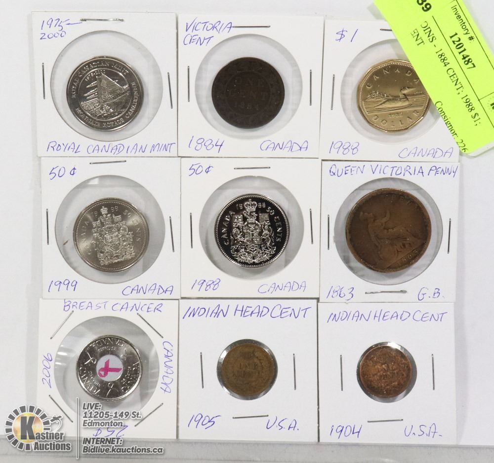 1988 CANADIAN 50 CENT; 1863 GB PENNY; 1904, 1905 US INDIAN HEAD PENNIES; 2 OTHERS-COINS & CURRENCY
