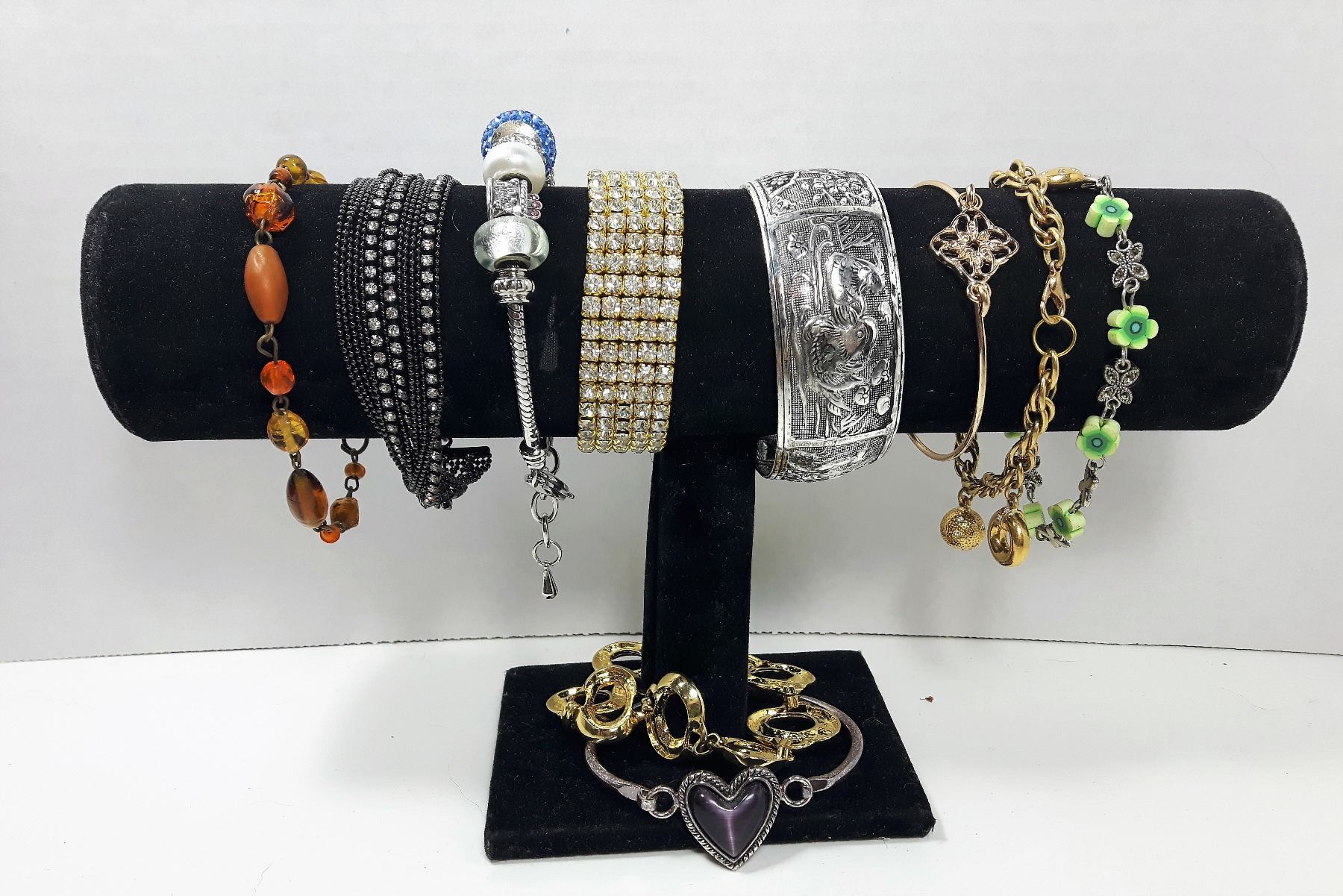 INCLUDING GOLD TONE CHAIN & CHARMS, PANDORA STYLE, TIBETAN SILVER CUFF, RHINESTONE STRETCHY, PURPLE CAT'S EYE HEART HINGED, ETC. JEWELRY