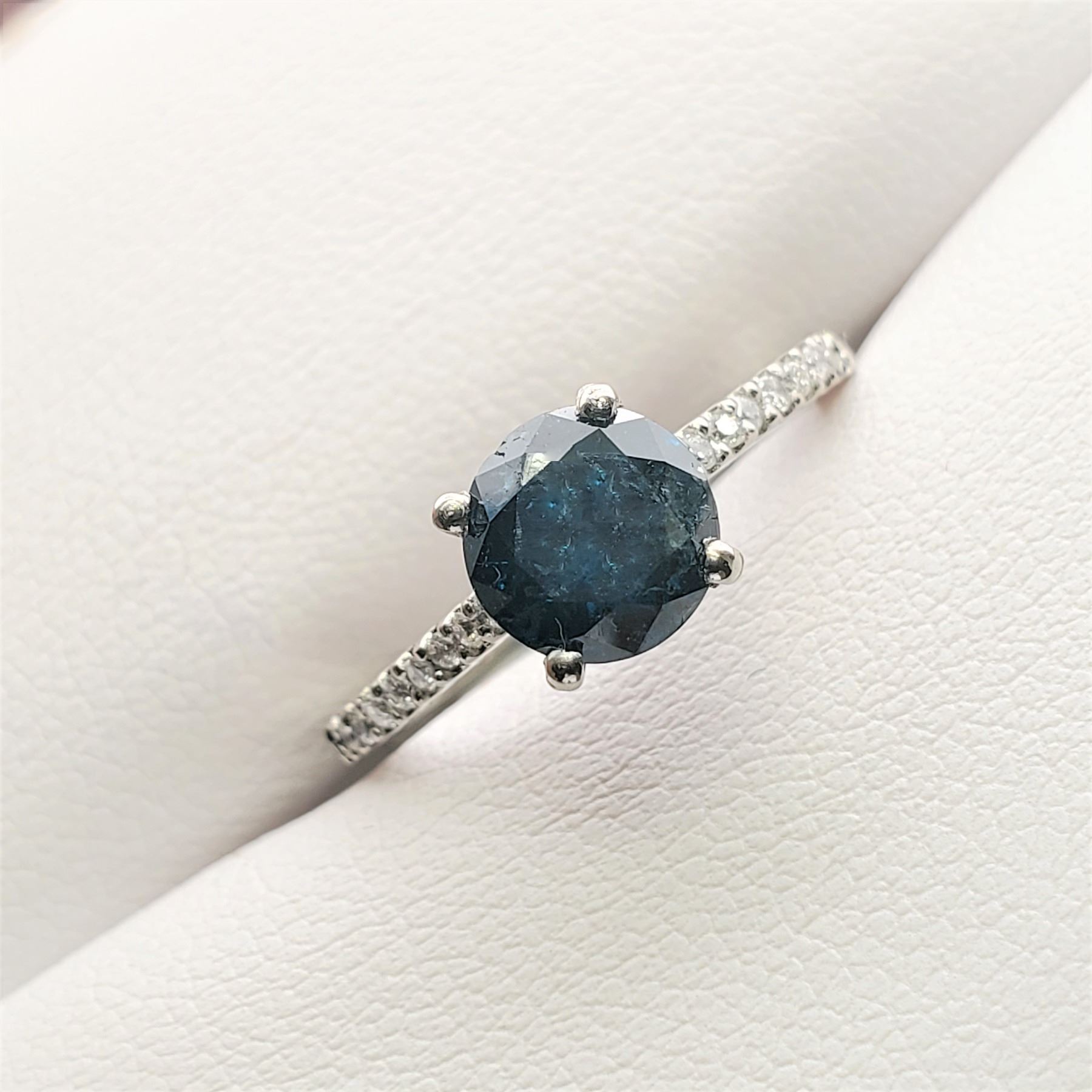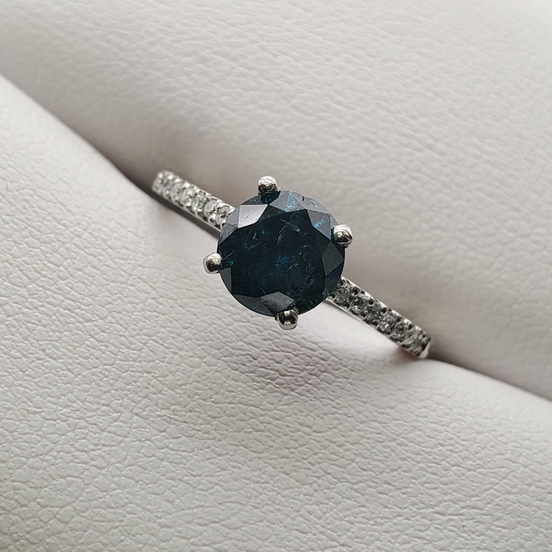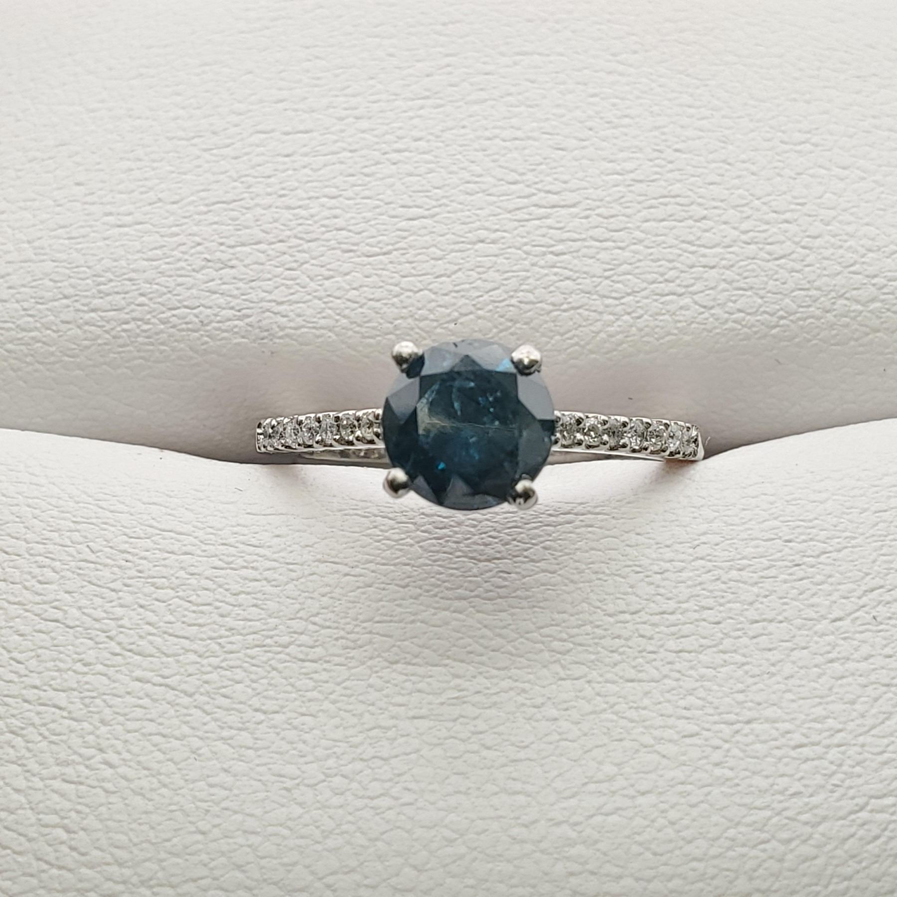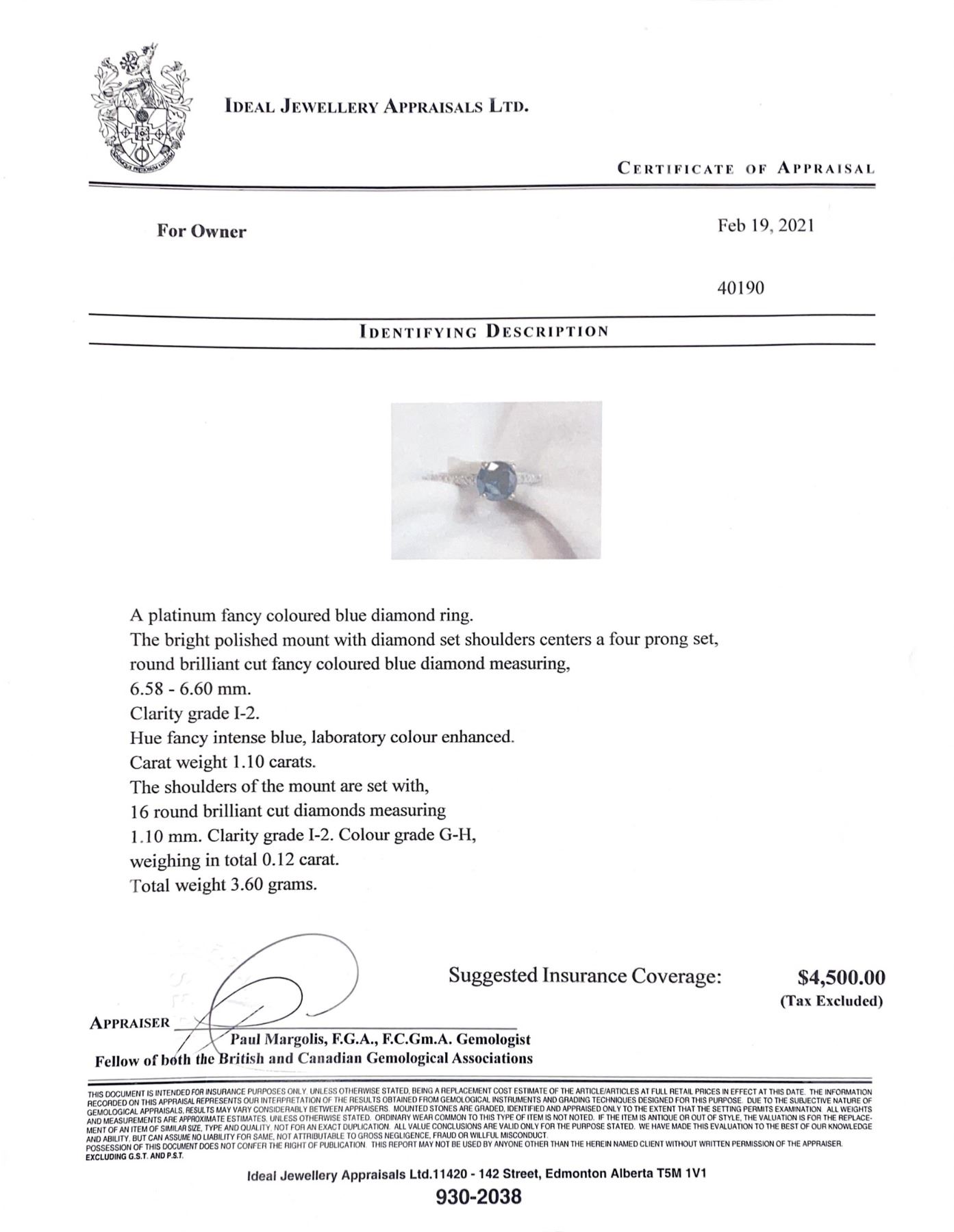 SIZE 5.75 A PLATINUM FANCY COLOURED BLUE DIAMOND RING. THE BRIGHT POLISHED MOUNT WITH DIAMOND SET SHOULDERS CENTERS A FOUR PRONG SET,ROUND BRILLIANT CUT FANCY COLOURED BLUE DIAMOND MEASURING, 6.58 -660 MM. CLARITY GRADE 1-2. HUE FANCY INTENSE BLUE, LABORATORY COLOURENHANCED. CARAT WEIGHT 1.10 CARATS. THE SHOULDERS OF THE MOUNT ARE SET WITH, 16 ROUND BRILLIANT CUT DIAMONDS MEASURING 1.10 MM. CLARITY GRADE I-2. COLOUR GRADE G-H,WEIGHING IN TOTAL 0.12 CARAT. TOTAL WEIGHT 3.60 GRAMS. CERTIFICATE OF APPRAISAL FROM LOCAL APPRAISER, SUGGESTED INSURANCE COVERAGE $4500.00.