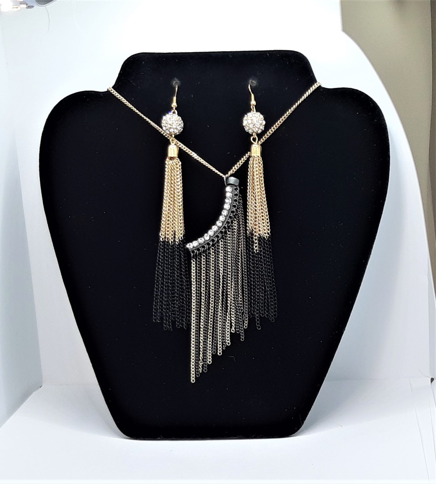 CRYSTAL PENDANT ON 22" CHAIN AND COORDINATING DROP EARRINGS, BOTH ITEMS FEATURE CHAIN DETAIL WITH CLEAR CRYSTAL ACCENTS. JEWELRY