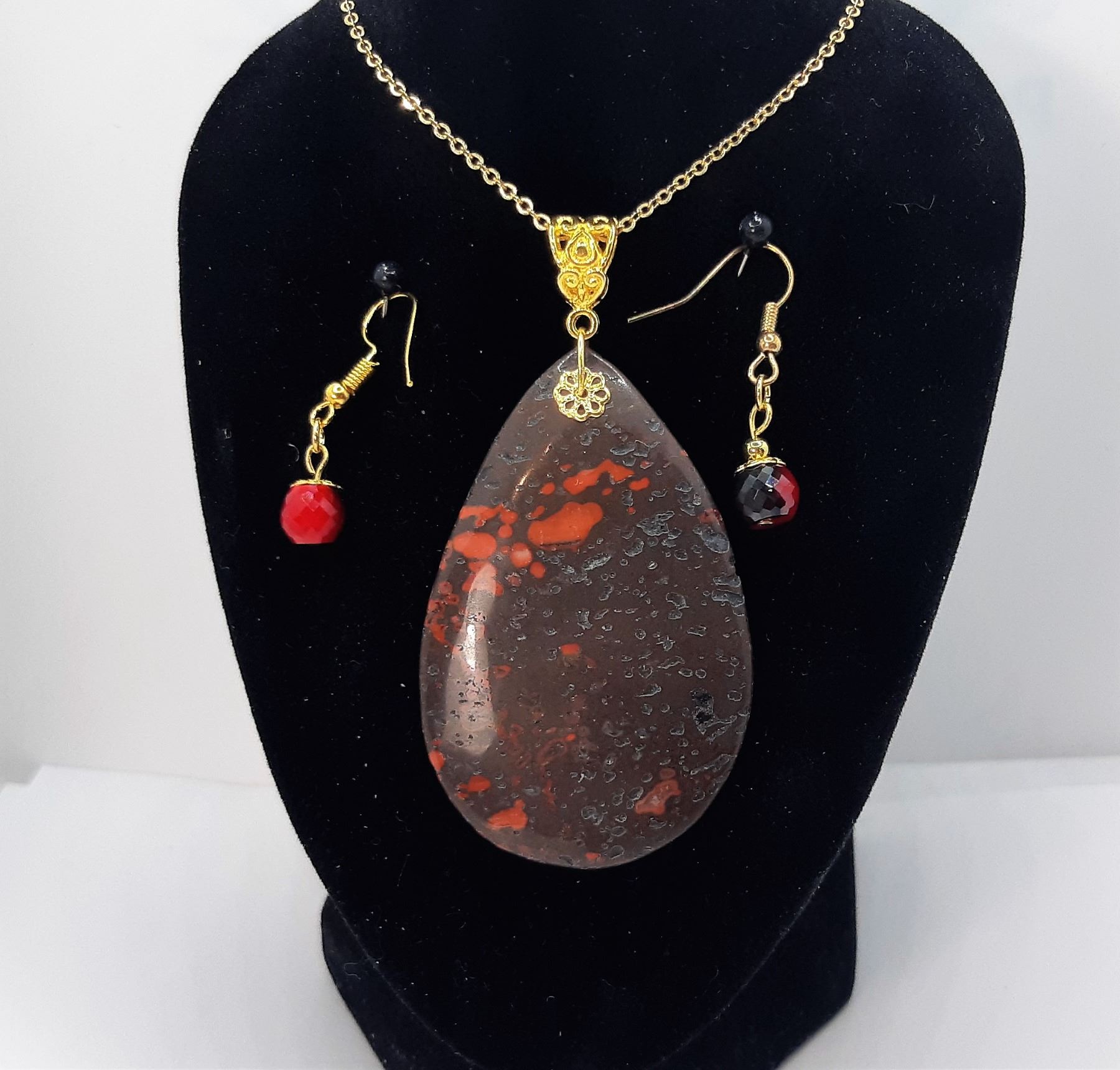 PENDANT ON 16" GOLD TONE CHAIN AND MATCHING DROP EARRINGS ON NICKLE FREE WIRES. JEWELRY