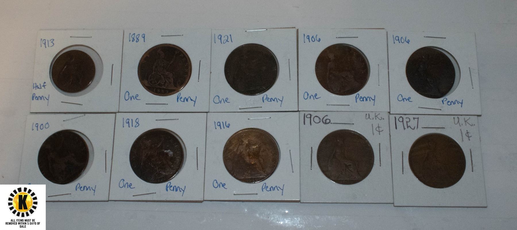 9 UK PENNIES & 1 UK 1/2 PENNY
