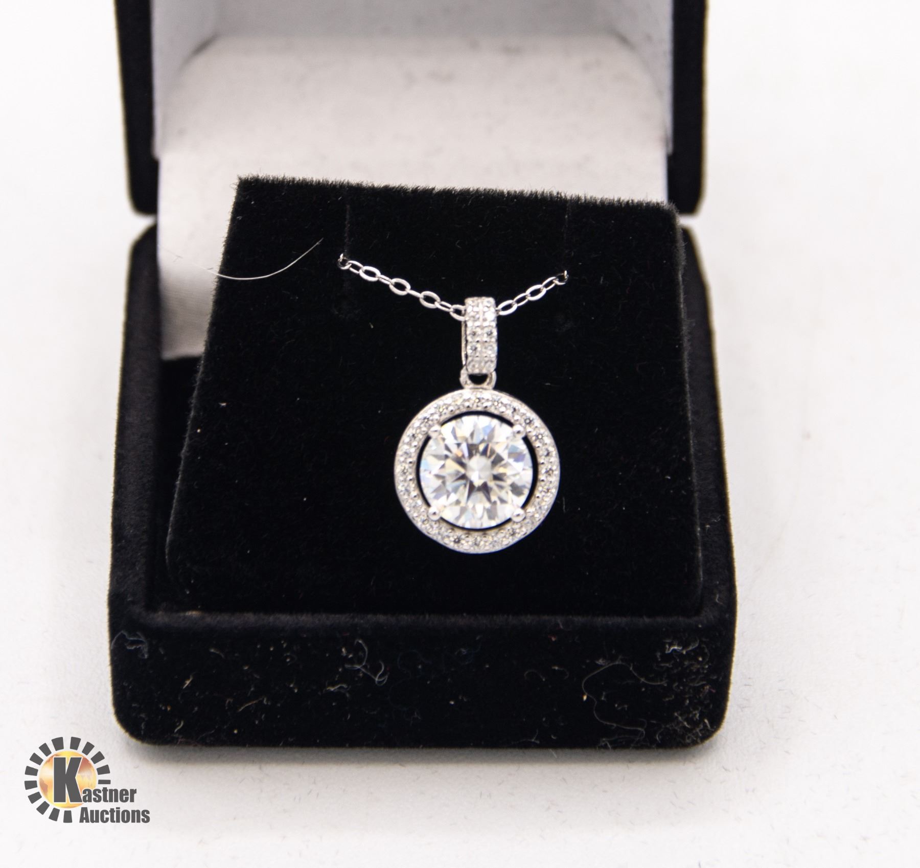 BLUE COLOR SURROUNDED BY ROUND HALO WITH 34 ROUND BRILLIAN CUBIC ZIRCONIA SET WITH MORE IN BAIL WEIGHING A TOTAL 0.34 CT RETAIL VALUE $1,200.00