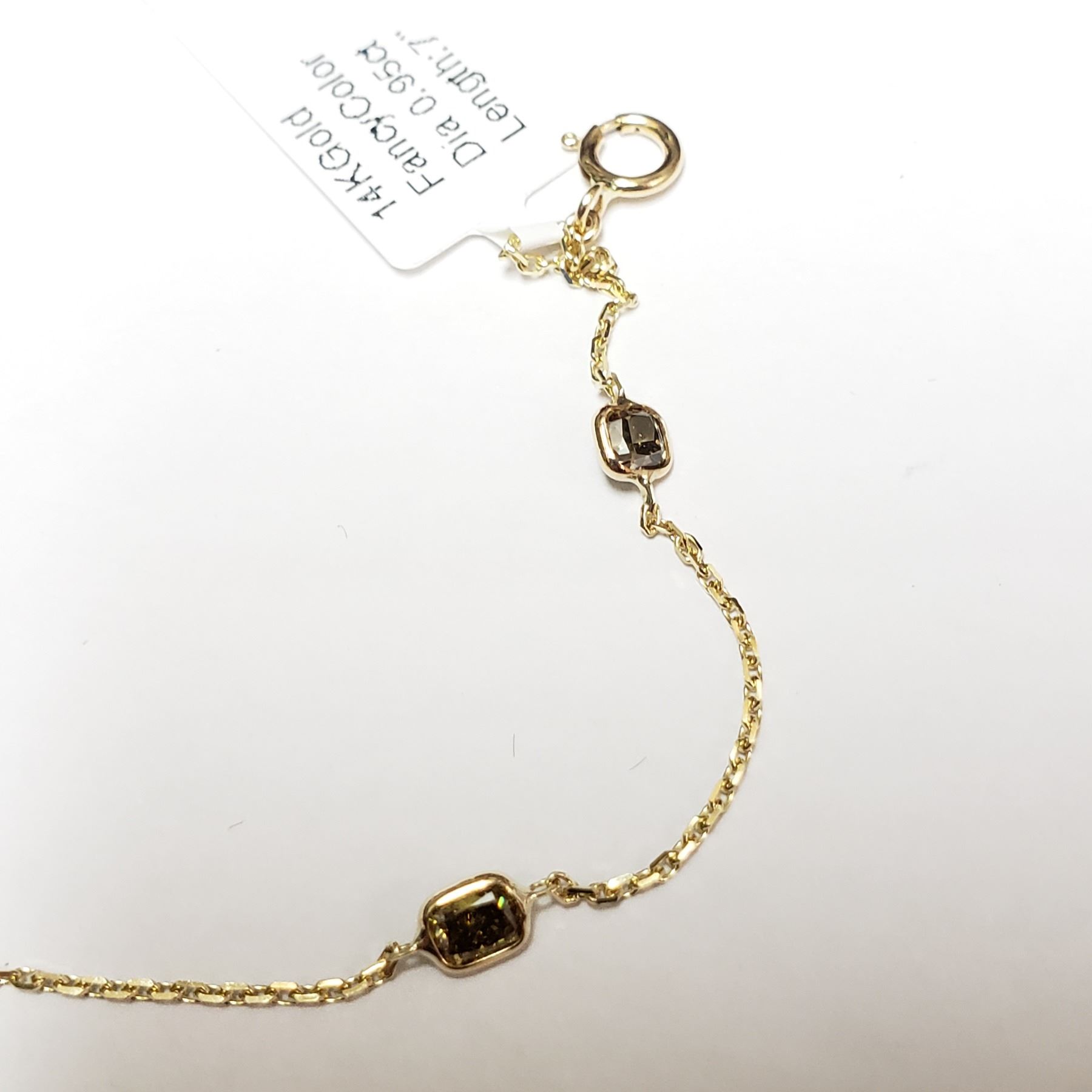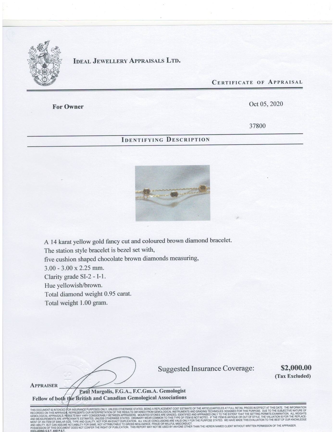 DIAMOND BRACELET. THE STATION STYLE BRACELET IS BEZEL SET WITH FIVE CUSHION SHAPED CHOCOLATE BROWN DIAMONDS (MEASURING 3.00 - 3.00 X 2.25 MM, CLARITY GRADE SI-2 - I-1, HUE YELLOWISH/BROWN. TOTAL DIAMOND WEIGHT 0.95 CARAT) COMES WITHCERTIFICATE OF APPRAISAL FROM LOCAL APPRAISER, SUGGESTED INSURANCE COVERAGE $2000.00. JEWELLERY
