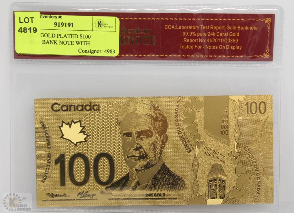 92) 24KT GOLD PLATED $100 CANADA BANK NOTE WITH