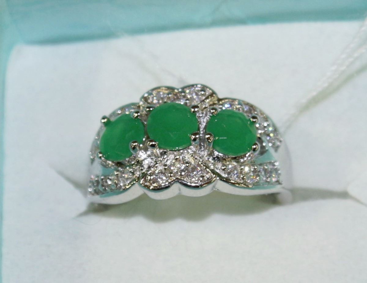 .925 SILVER NATURAL EMERALD & CZ RING - SIZE 6.5