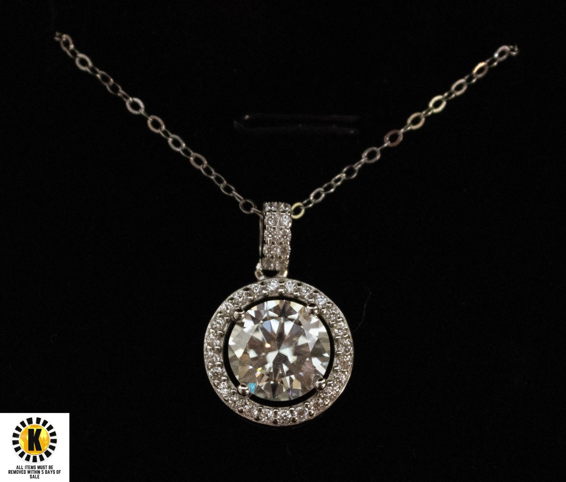 BY 34 CUBIC ZIRCONIA IN HALO AND IN BAIL IN PENDANT WEIGHING 0.34 CT TOTAL GRA CERTIFIED STAMPED 925 APPRAISED VALUE $1,680.00