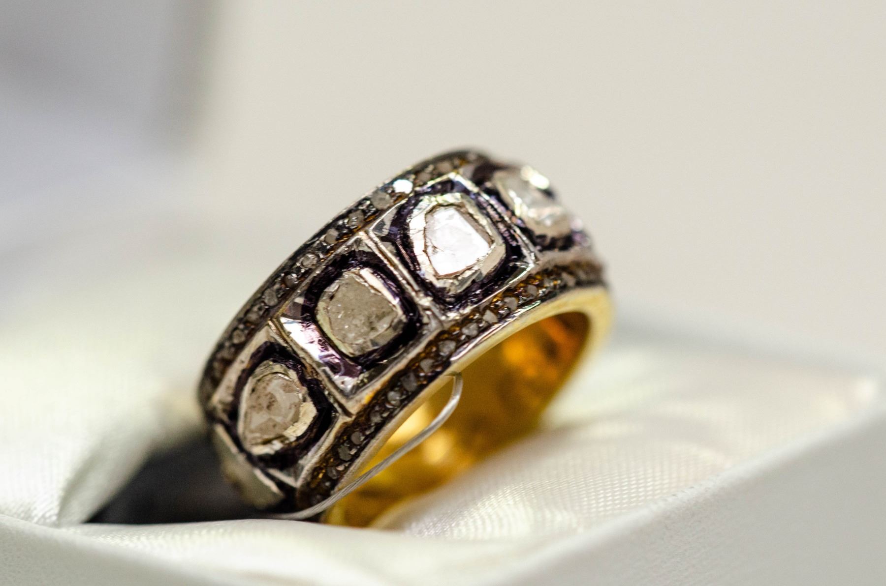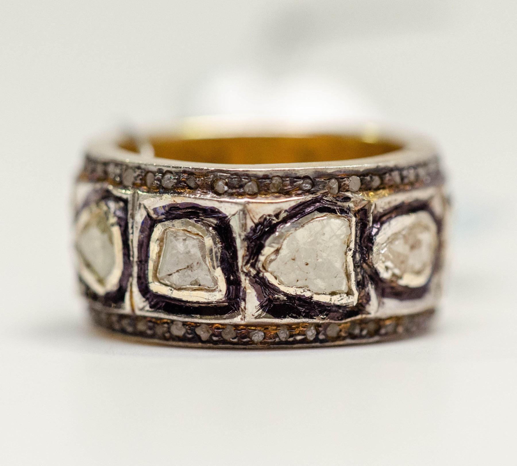 THE BRIGHT CUT BAND IS BEZEL SET WITH 10 FOIL BACKED DIAMOND CLEAVAGES (MEASURING TO 5.50 - 4.50 MM) BORDERING ARE 84 ROUGH DIAMOND CRYSTALS (MEASURING 1.00 MM, TOTAL DIAMOND WEIGHT 1.30 CARATS) COMES WITH CERTIFICATE OF APPRAISAL FROMLOCAL APPRAISER, SUGGESTED INSURANCE COVERAGE $1000.00. JEWELLERY