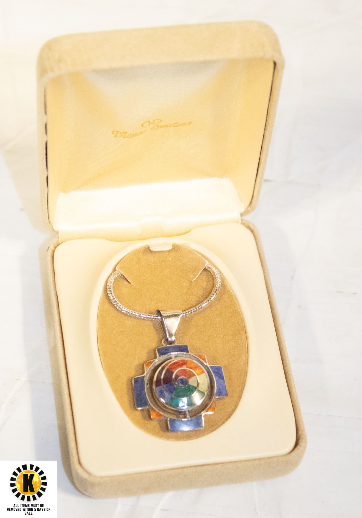 ON A 19" 925 STAMPED CHAIN, "950" IS STAMPED ON OUTSIDE OF CIRCLE IN PENDANT, CIRCLE ROTATES, PENDANT IS REVERSIBLE, 3 CM DIAMETER, IN A GIFT BOX