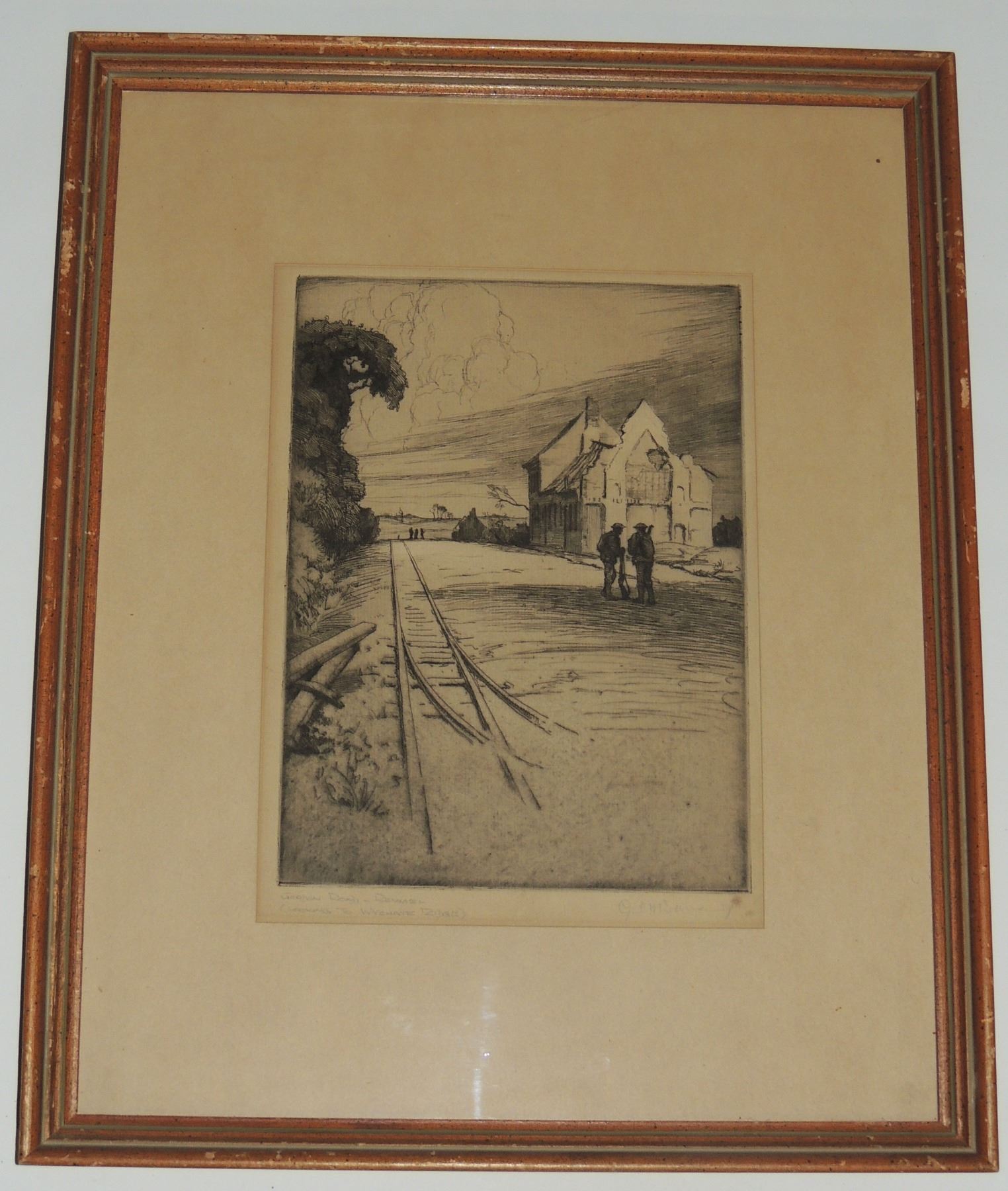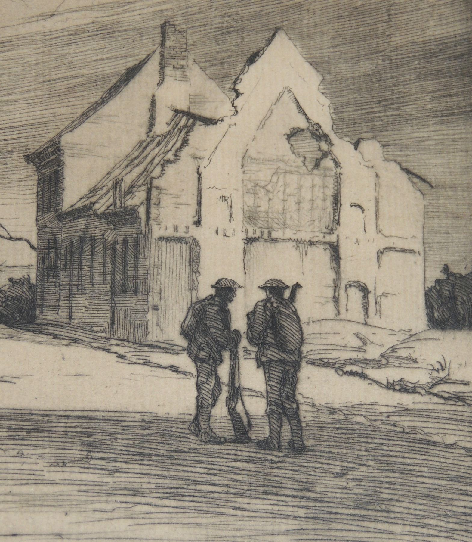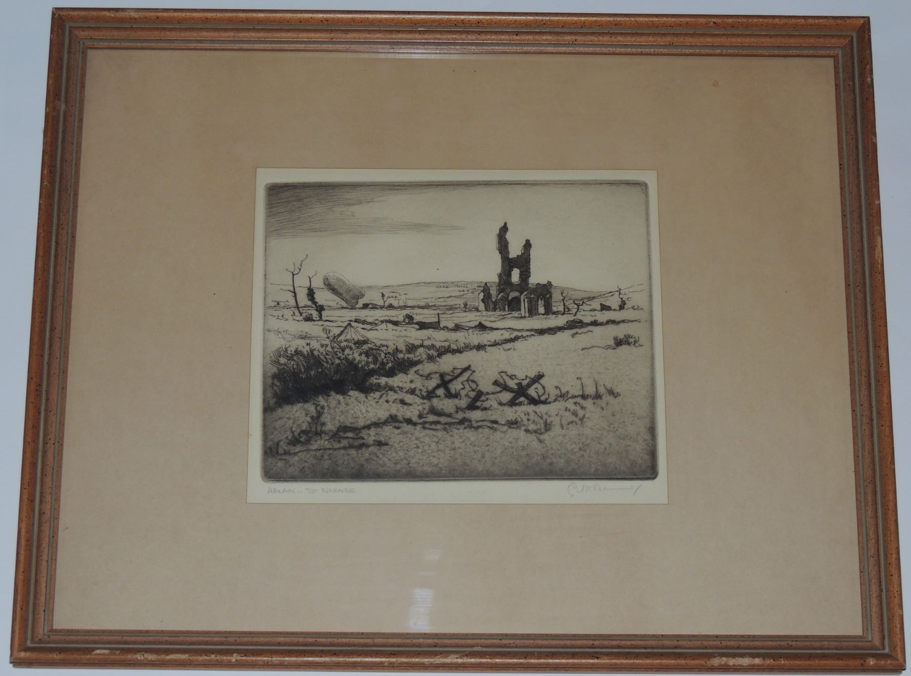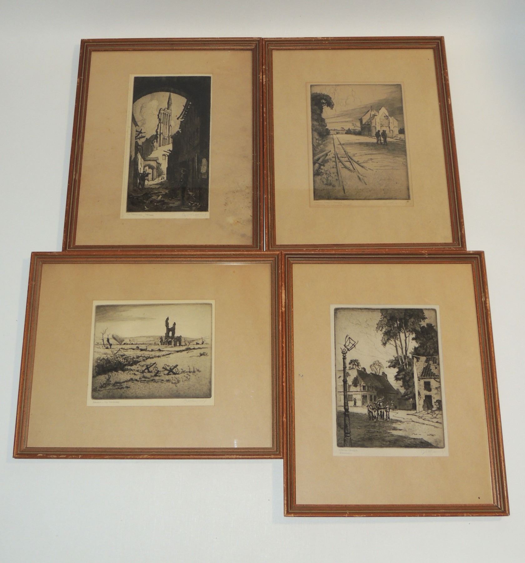 Each Frame Measured 18 x 14 inches in size, two frames have loose glass. All Signed by Cyril Henry Barraud (Canadian War Office Official War Artist during World War One.) Titles are "St Jacques Ypres", ""Ablain, St Nazaire", and "Cross Roads Kemmel", "Gordon Road Remmel (Looking to Wychate Ridge". World War One Canadian / British Artwork.