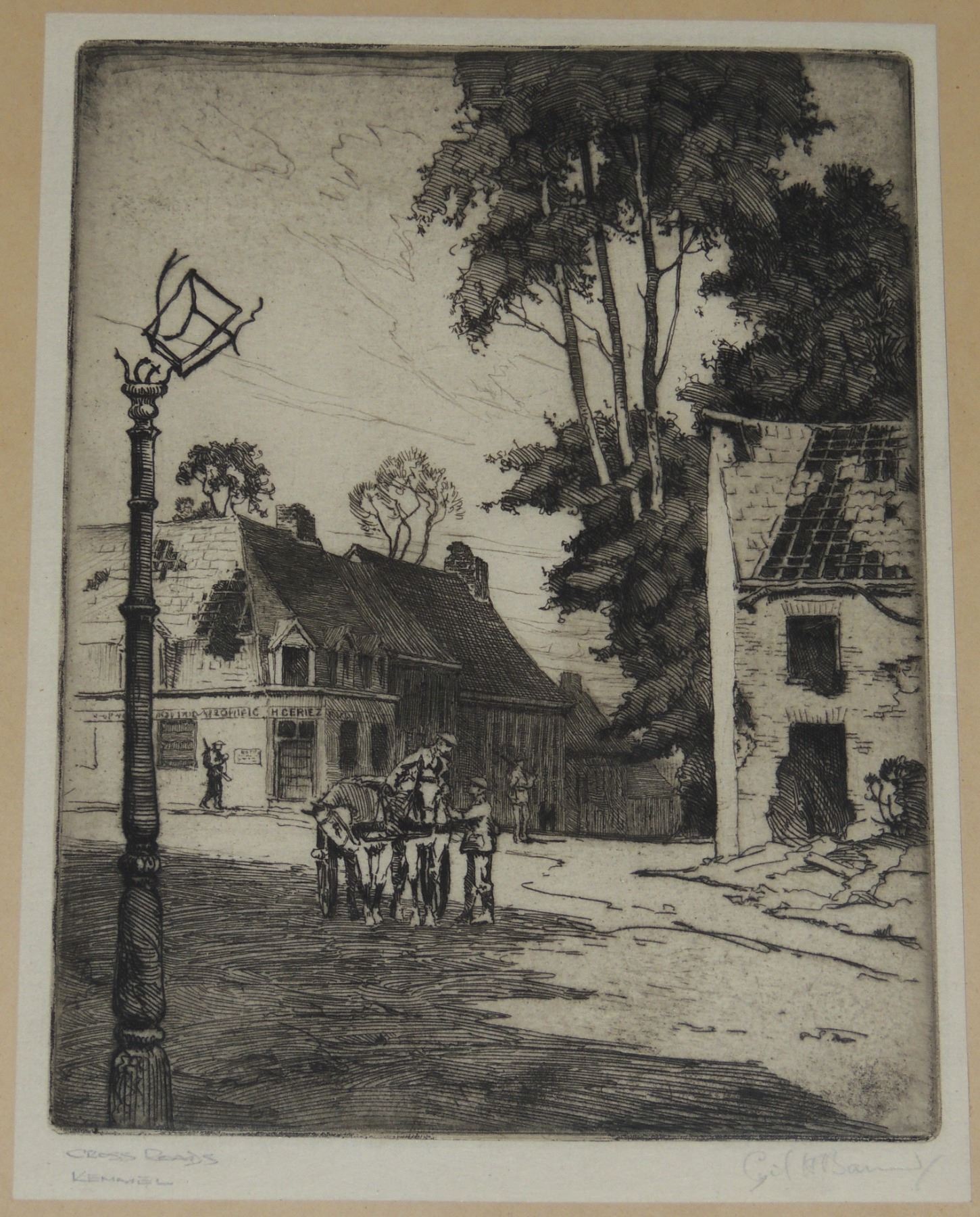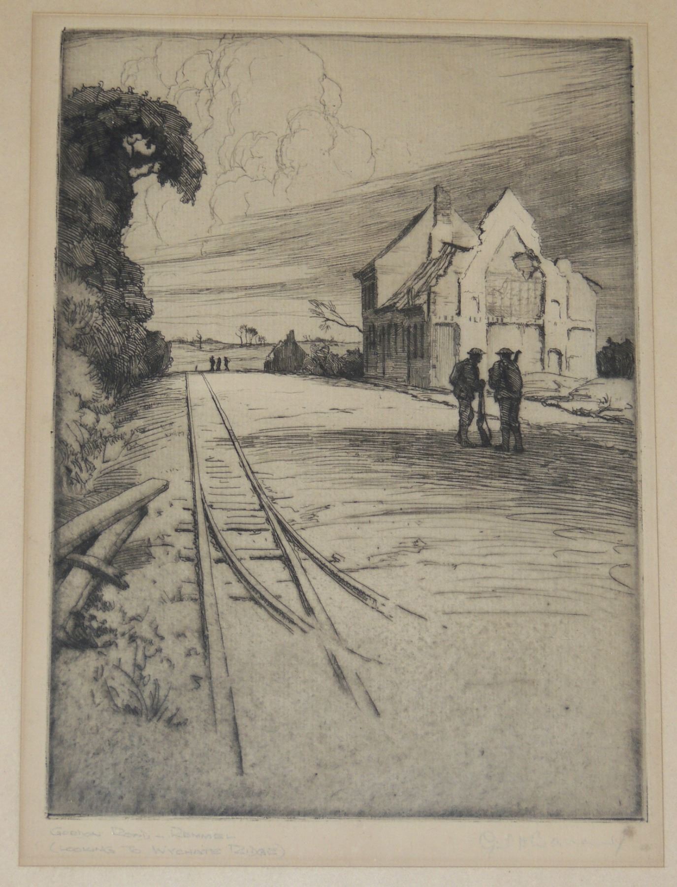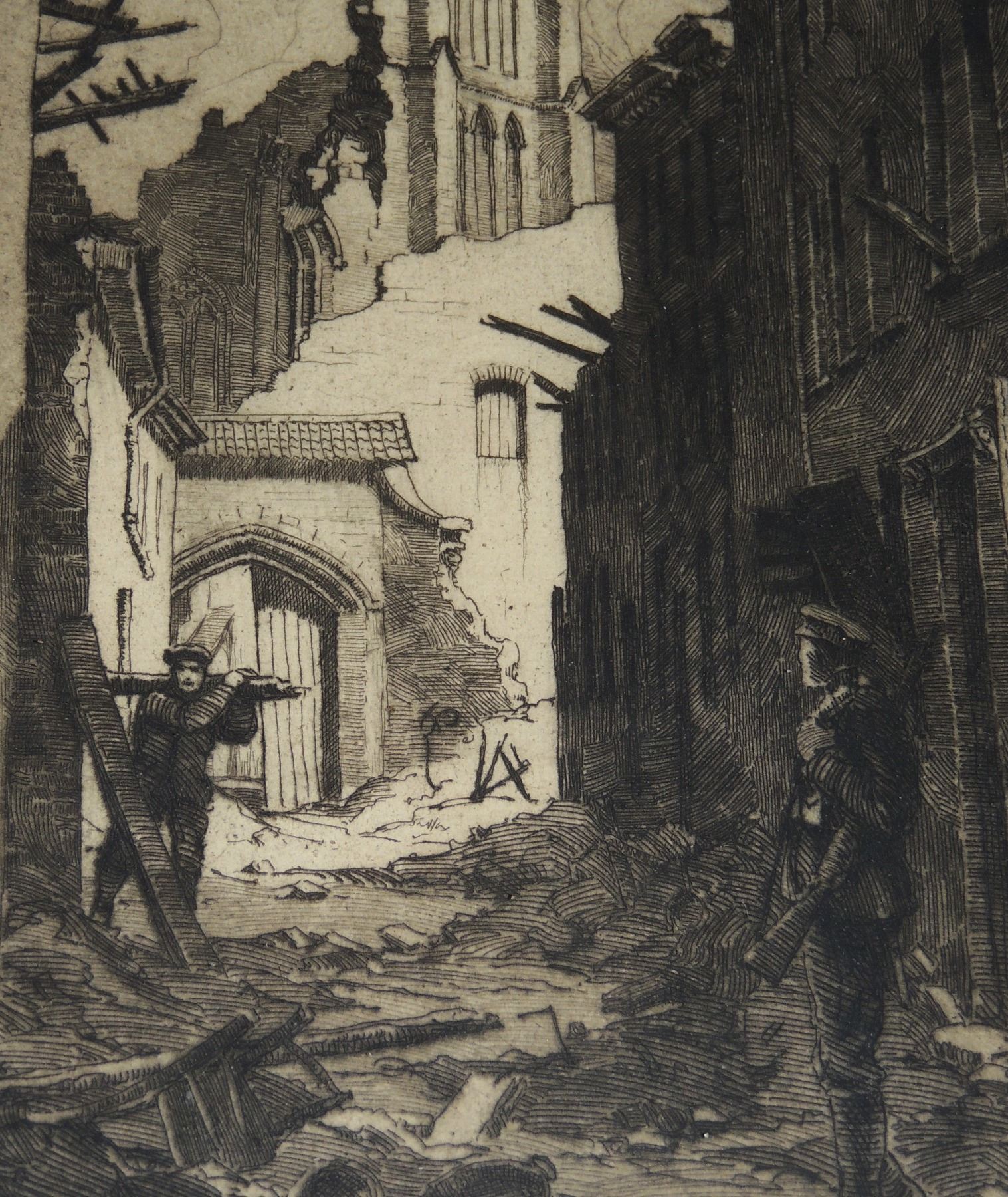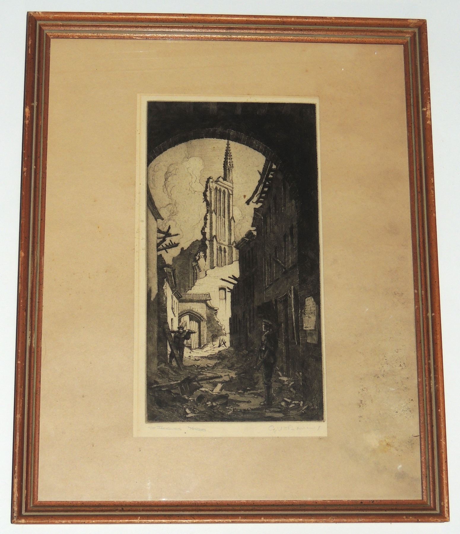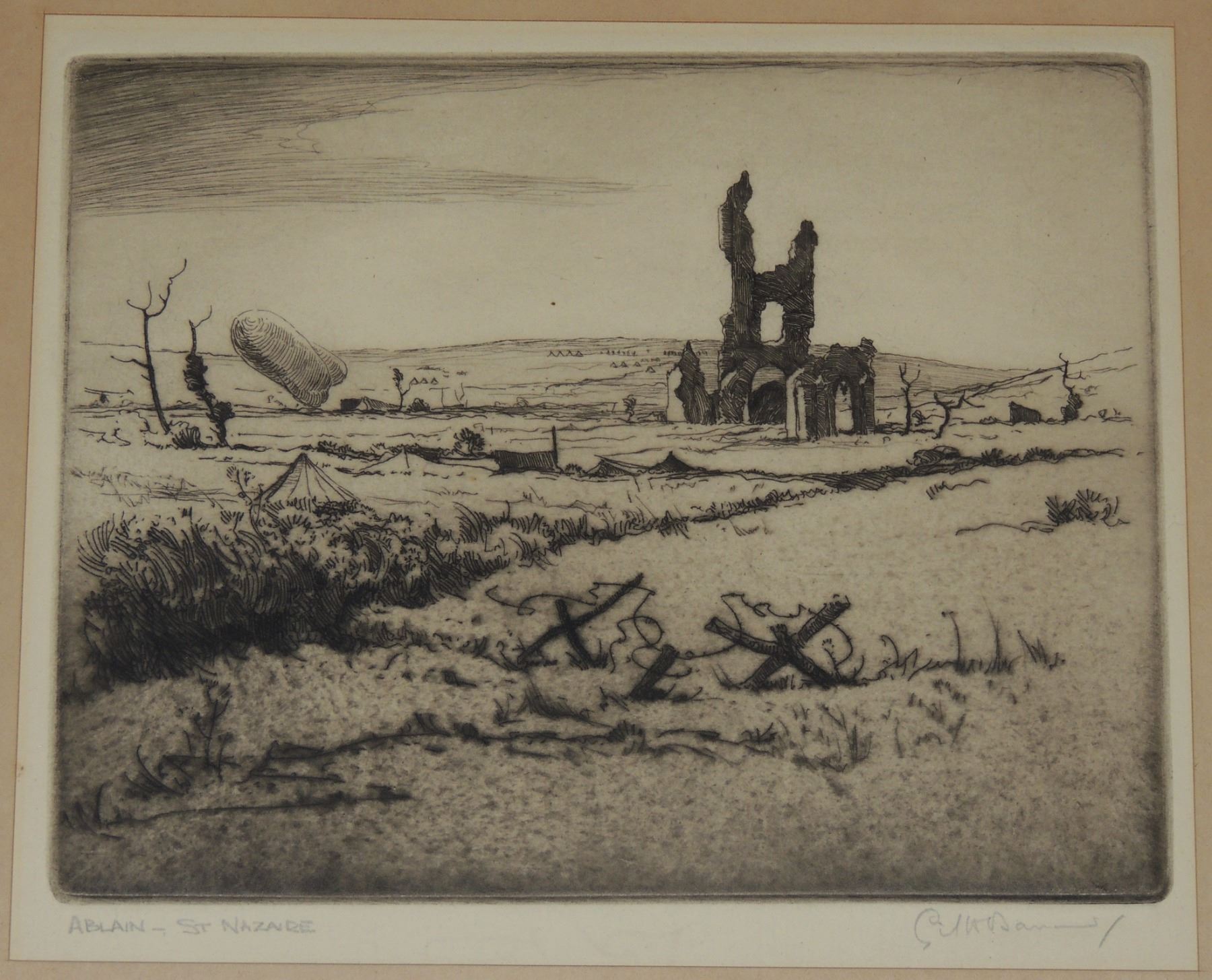 Each Frame Measured 18 x 14 inches in size, two frames have loose glass. All Signed by Cyril Henry Barraud (Canadian War Office Official War Artist during World War One.) Titles are "St Jacques Ypres", ""Ablain, St Nazaire", and "Cross Roads Kemmel", "Gordon Road Remmel (Looking to Wychate Ridge". World War One Canadian / British Artwork.