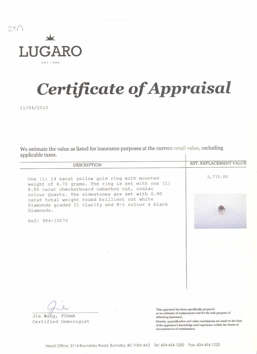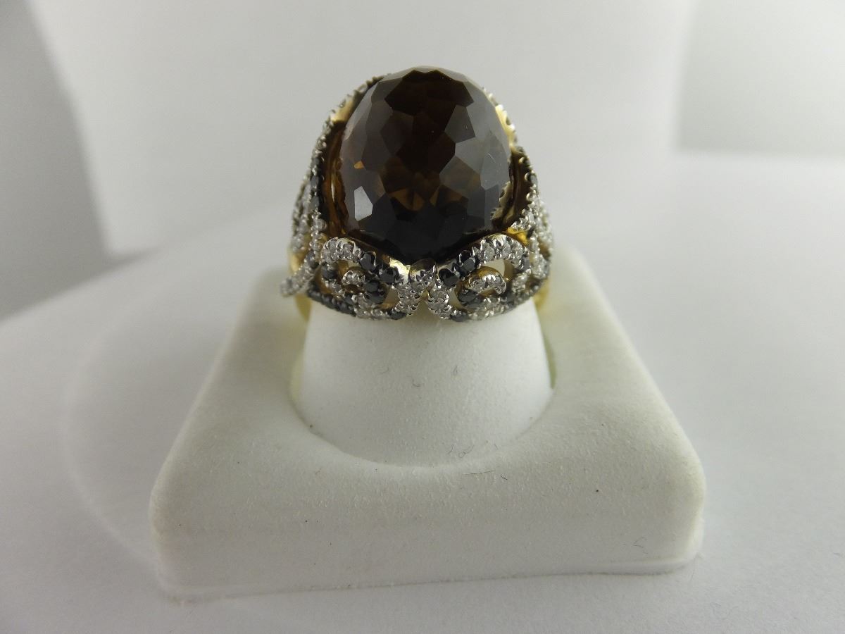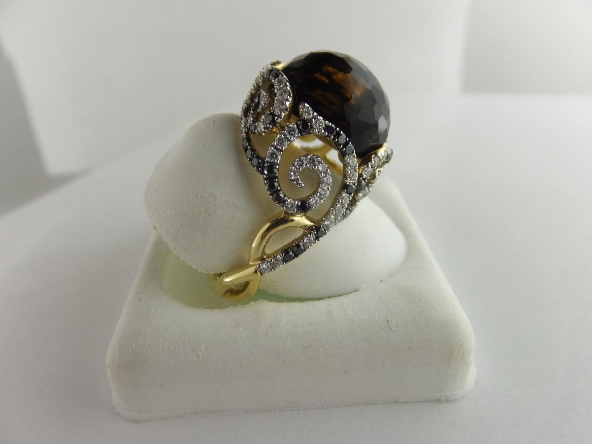 and black diamond dinner ring; 1= 8.55ct quartz, checkerboard cabachon cut, cognac color, side stones, .90cts t.w. round brilliant cut diamonds, black and I1 clarity, H/I color, appraisal. Size 71/4. RETAIL VALUE $5,775.00