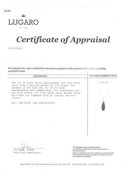CHAIN, 1=23.70cts. ONYX CHECKERBOARD DROP SHAPED, SIDE DIAMONDS 110=.45cts. T.W. ROUND BRILLIANT CUT, SI CLARITY, F/G COLOR, APPRAISAL, RETAIL VALUE $2,100.00