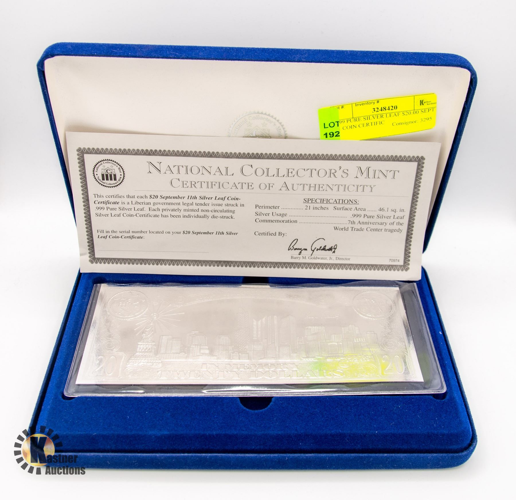 .999 PURE SILVER LEAF $20.00 SEPT 11 COIN CERTIFIC