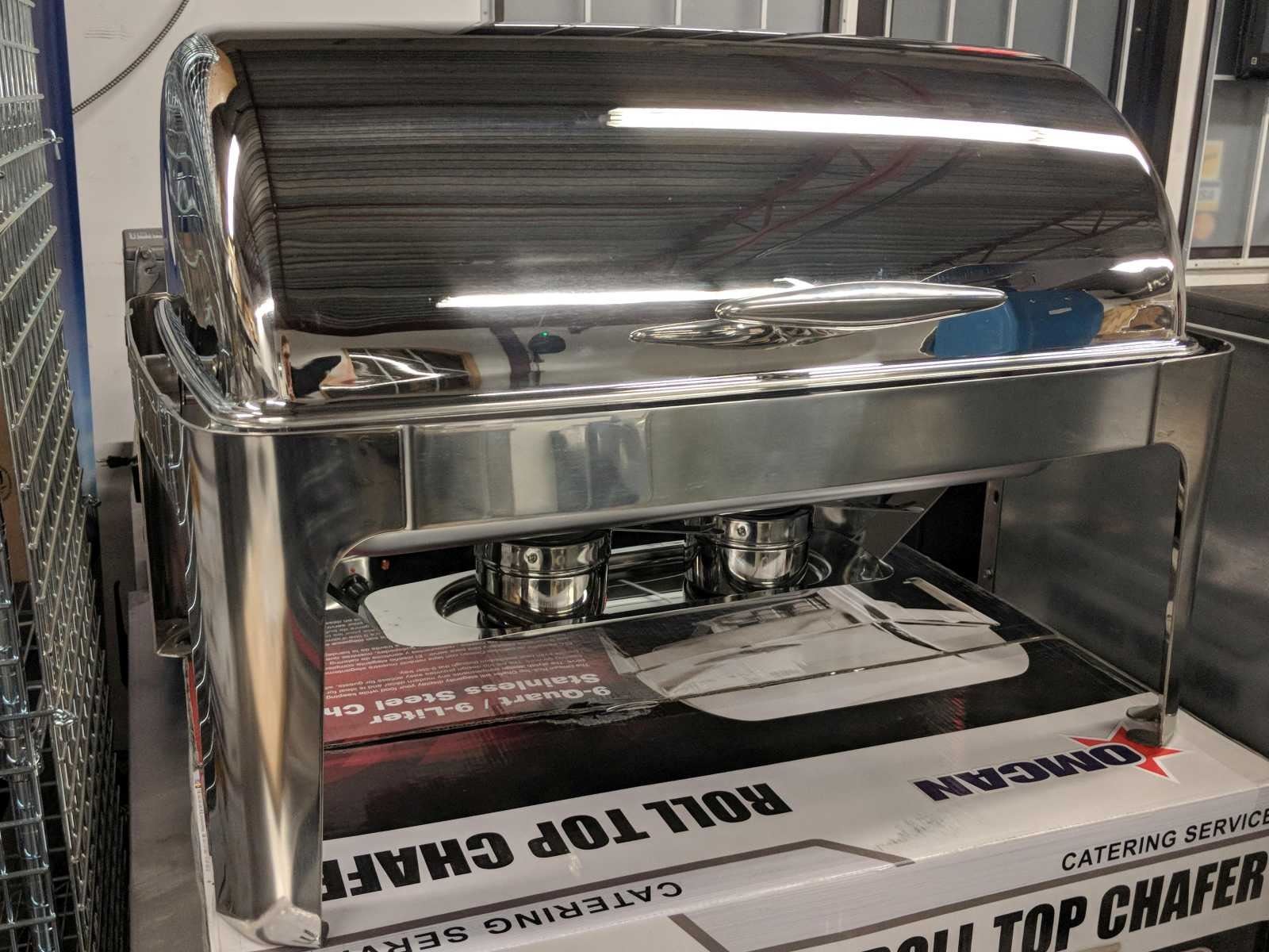 K116 NEW 9L STAINLESS ROLL TOP CHAFING DISH WITH FIXED LEGS, OMCAN 41821