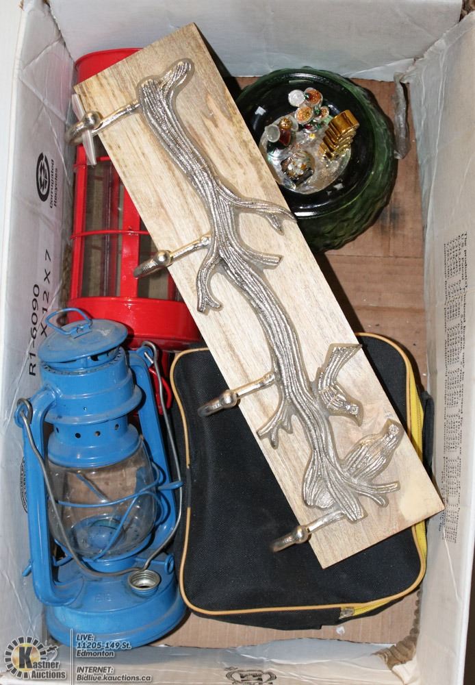 A BOX W/ FLASHLIGHT, OIL LAMPS, ETC