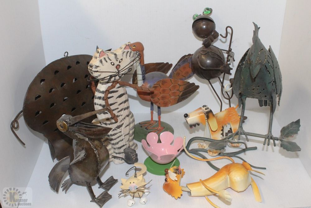 A LOT OF ANIMAL SCULPTURES, SOME WOOD & SOME METAL