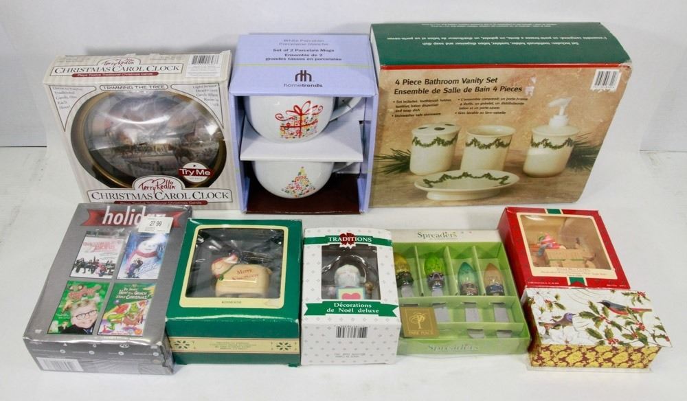 4 PC VANITY SET , TERRY REDIN CLOCK, SEALED 4 PACK HOLIDAY DVD'S, HOME TRENDS 2 LARGE PORCELAIN MUGS & MORE. HOUSEHOLD
