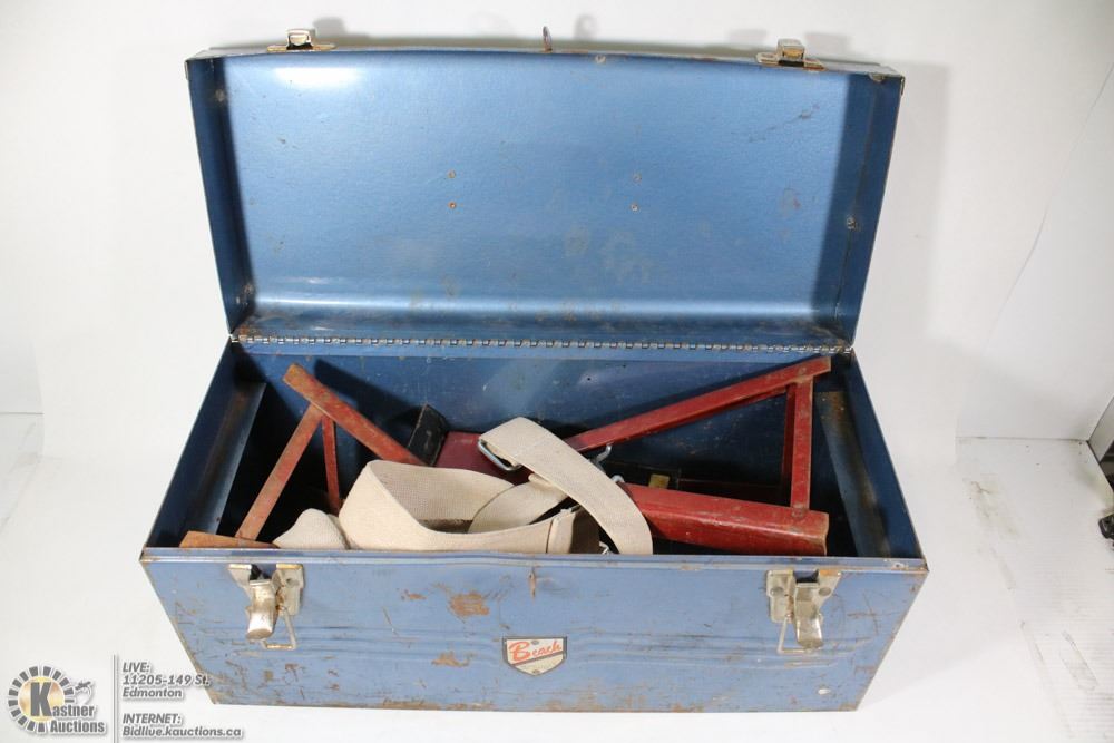 A METAL TOOLBOX W/ 2 JACK STANDS