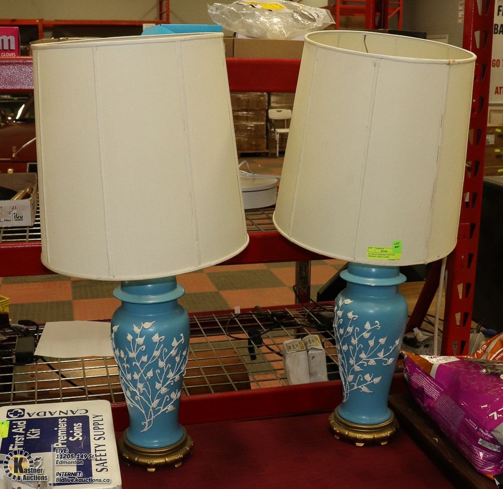 INCLUDING ORIGINAL SHADES. BLUE WITH HAND PAINTED, WHITE LEAFY VINE DETAILS.