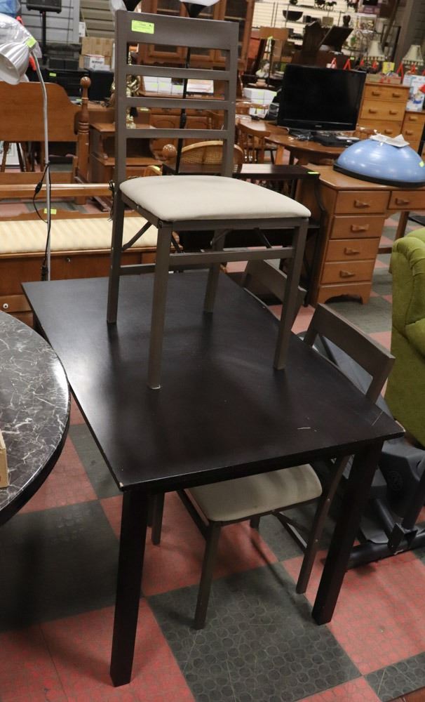 A TABLE WITH THREE FOLDING CHAIRS