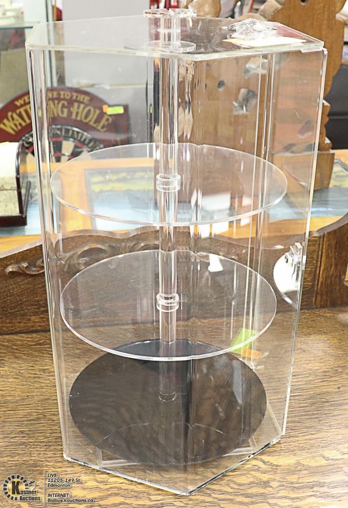 HEXAGON DESIGN, 3-TIER ROTATING SHELVES, LOCKING DOOR WITH KEY. KEY ON TAG 68 - DISPLAYS/JEWELLERY