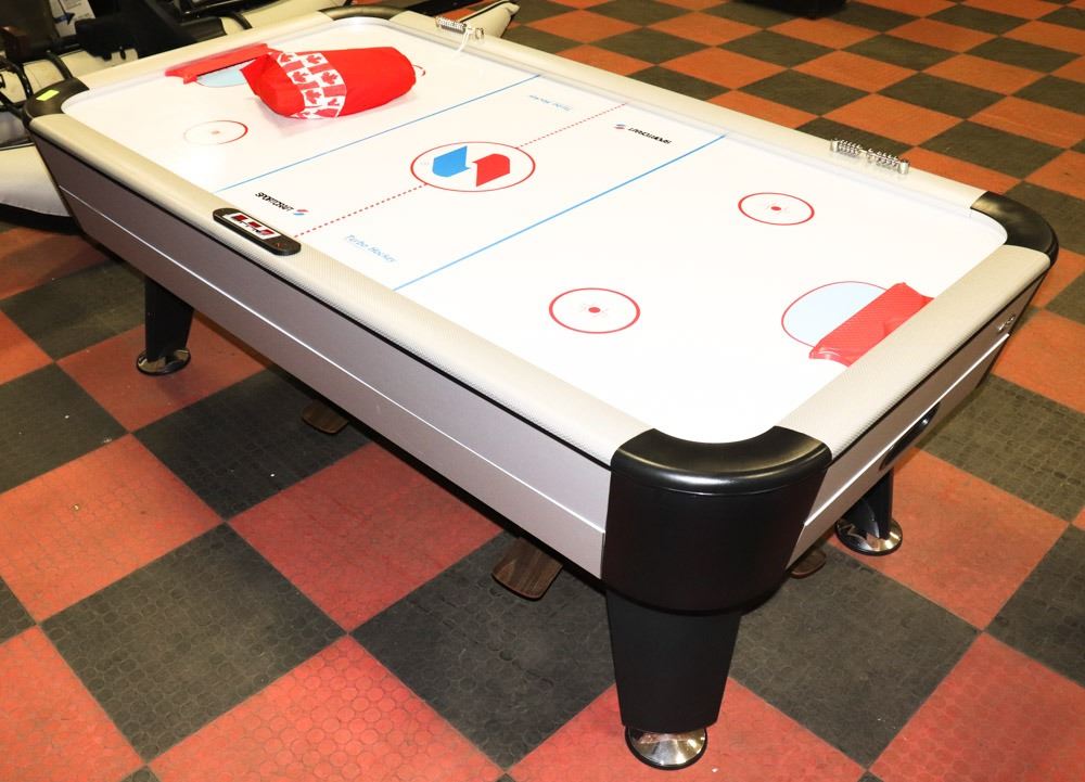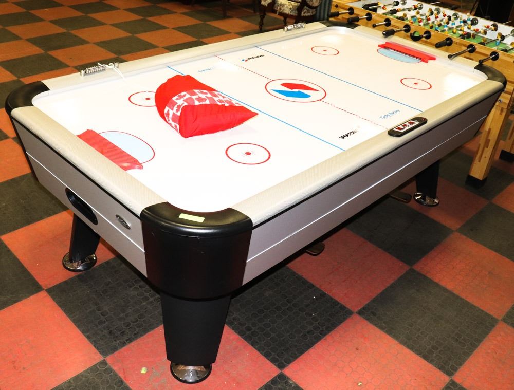 82" X 41" PLAYING SURFACE, 90" X 50" OVERALL DIMENTION, COMES COMPLETE WITH FOUR PADDLES AND FOUR PUCKS