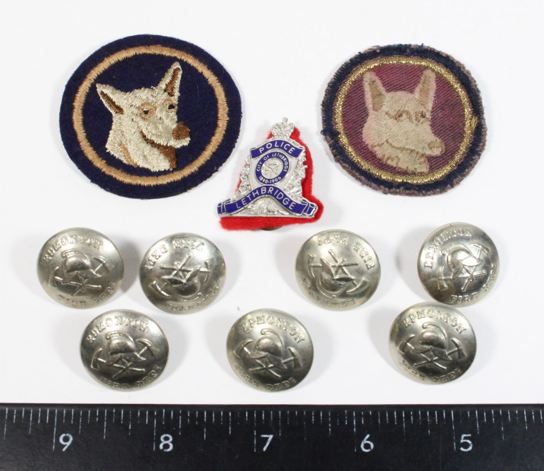 VINTAGE CANADA CANADIAN POLICE LAW ENFORCEMENT CAP BADGE INSIGNIA, 2 VARIATIONS RCMP K-9 SLEEVE PATCH PATCHES ROYAL CANADIAN MOUNTED POLICE VINTAGE POLICE LAW, ENFORCEMENT BADGE MOUNTIE INSIGNIA , AND 1940'S EDMONTON FIRE DEPARTMENT BUTTON LOT OF 7 1940'S 1950'S ERA KINGS CROWN J.R. GAUNT & SON MONTREAL CANADA CANADIAN FIREFIGHTER FIREMAN INSIGNIA