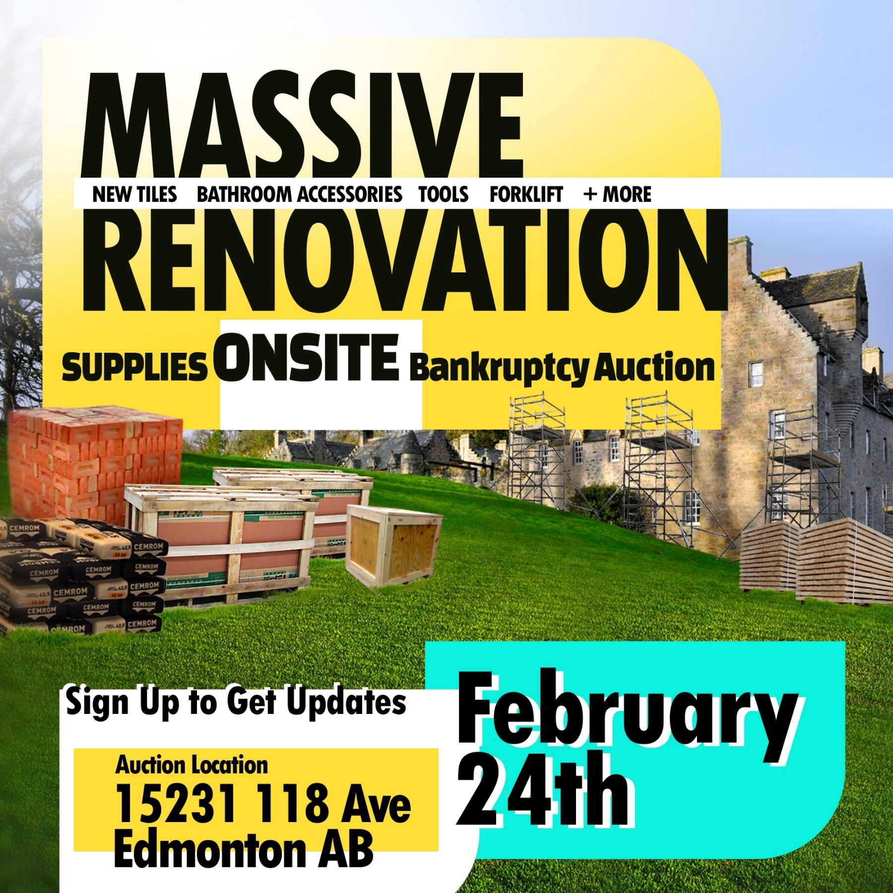 Monday Feb 26, Tues Feb 27, Wed Feb 28 - 9am to 6pm. A forklift will be available for load out. You will need to supply your own labour.