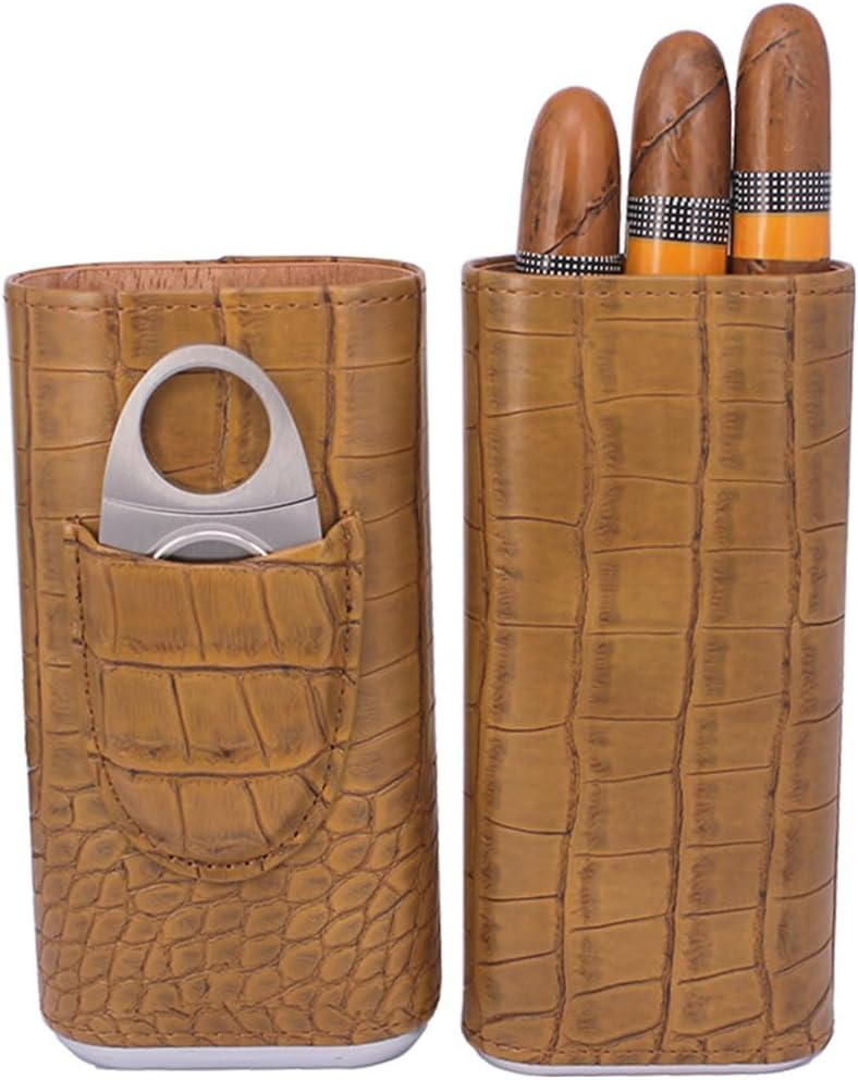 AMANCY 3- Finger Premium Vintage Brown Leather Travel Cigar Case With Cedar Wood Lined, Included Stainless Steel Cigar Cutter