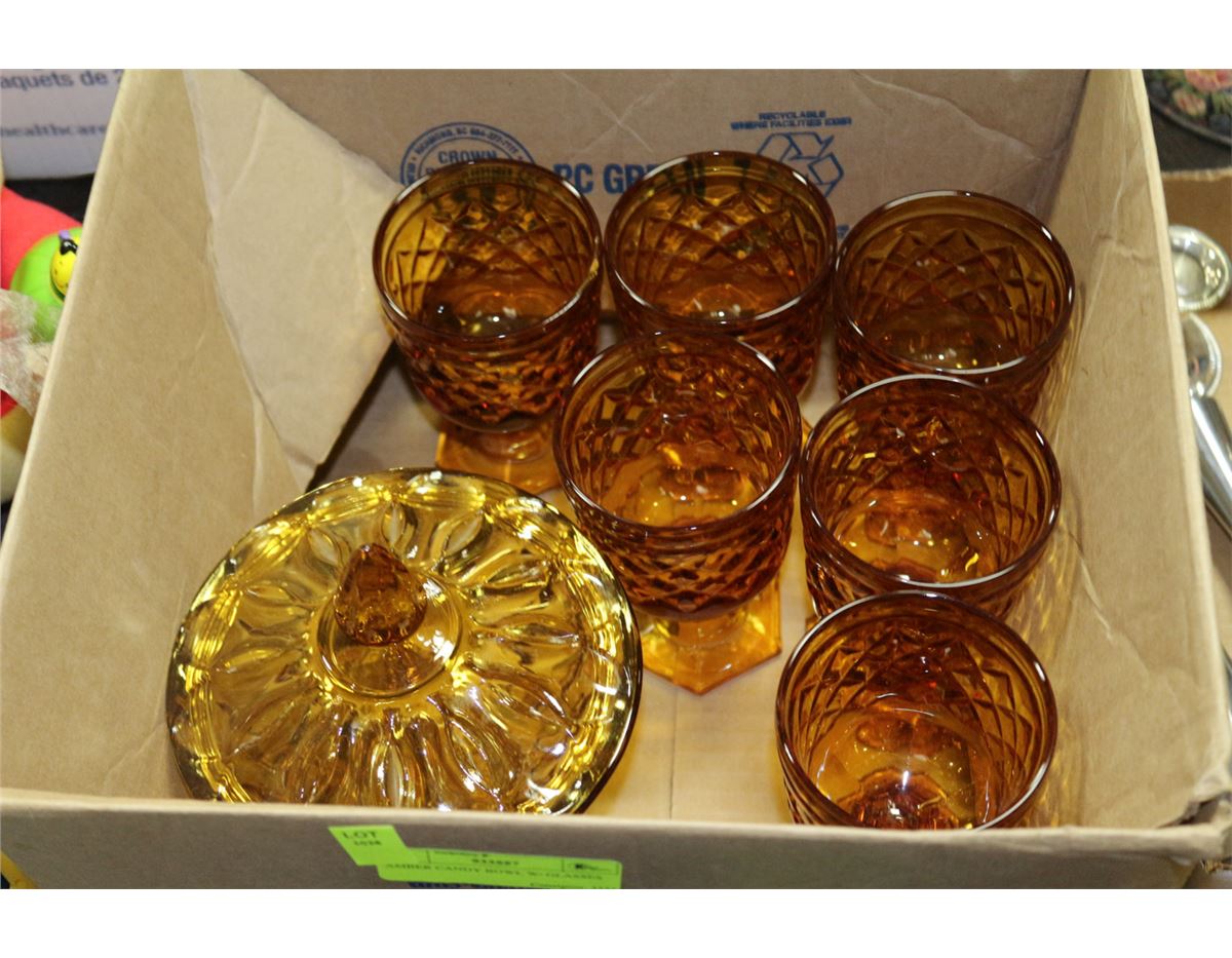 AMBER CANDY BOWL W/ GLASSES