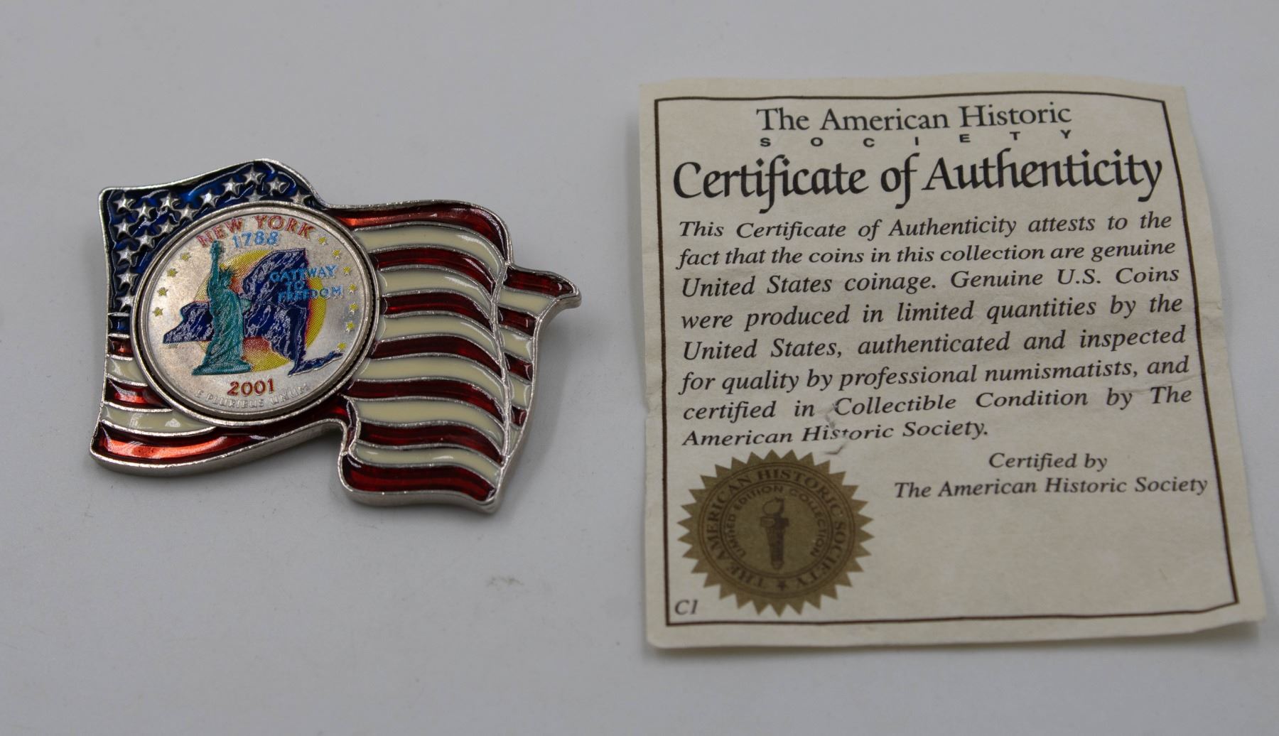 AMERICAN QUARTER COLORED COIN PIN W/COA