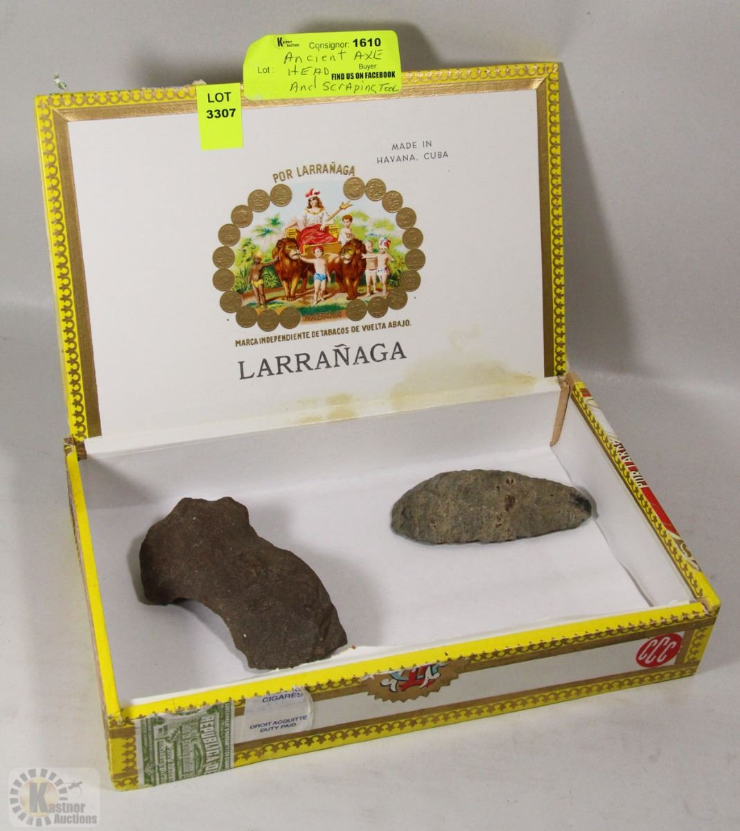 ANCIENT AXE HEAD & SCRAPING TOOL IN CIGAR BOX
