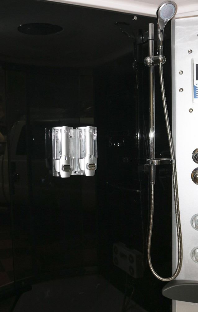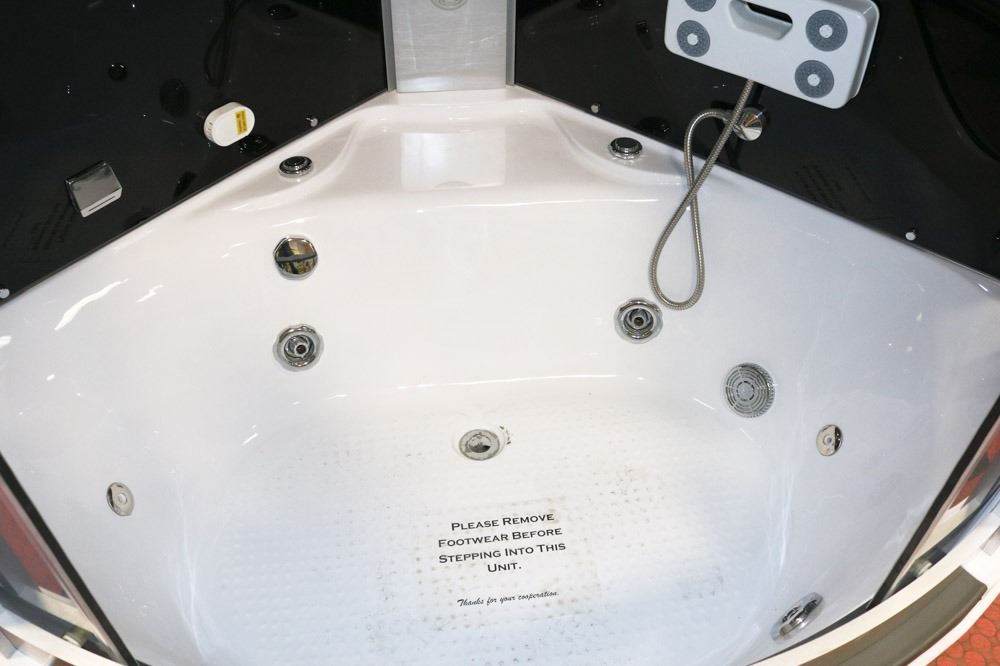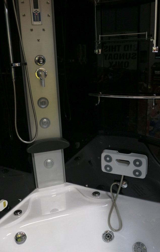 53"X53"X90", STEAM OVER HEAD LED RAIN SHOWER, HAND HELD SHOWER, BODY JETS, HYDROMASSAGE JETS, FOOT MASSAGER, SHAMPOO RACK, TOWEL RACK, SOAP DISPENSERS, LED LIGHTING, FM RADIO/AUX INPUT, BUILT IN SEAT, AROMATHERAPY PORT. GENERAL