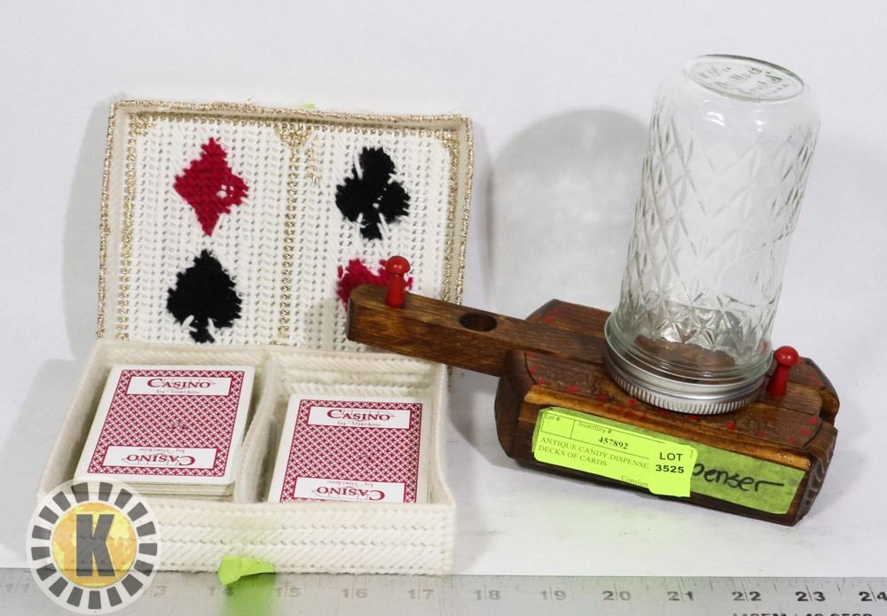 ANTIQUE CANDY DISPENSER AND 2 DECKS OF CARDS