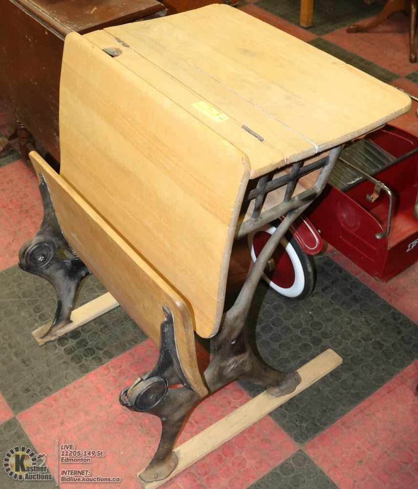 ANTIQUE CAST IRON AND WOOD STUDENT DESK.