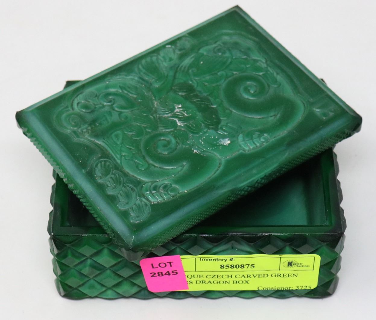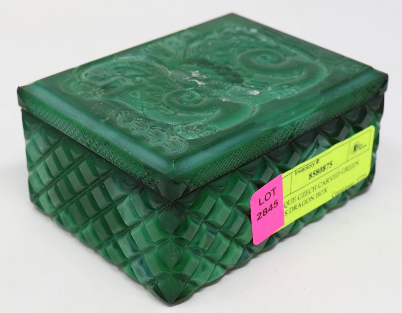 ANTIQUE CZECH CARVED GREEN GLASS DRAGON BOX