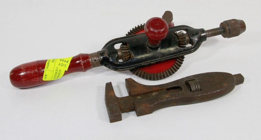 ANTIQUE DRILL AND CAST IRON WRENCH