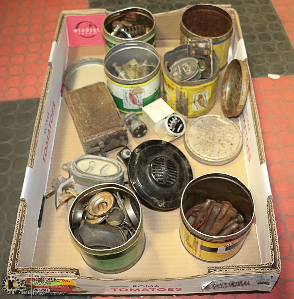 LARGE FLAT WITH VINTAGE TOBACCO TINS FULL OF MODEL "A" AND "T" HARDWARE INCL. GAUGES, DOOR HANDLES, HORN, IGNITION, ETC. - ANTIQUES