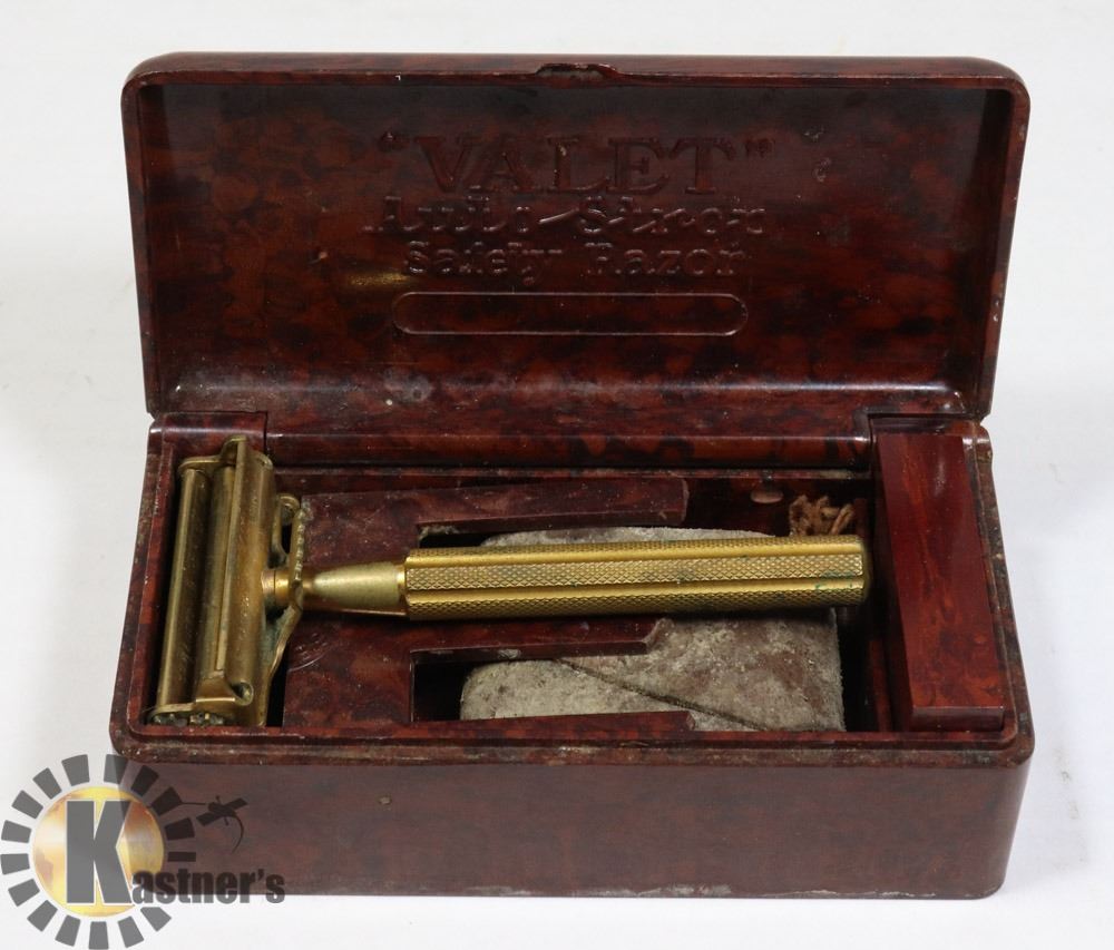 ANTIQUE GOLD PLATE VALET AUTO STROP RAZOR IN