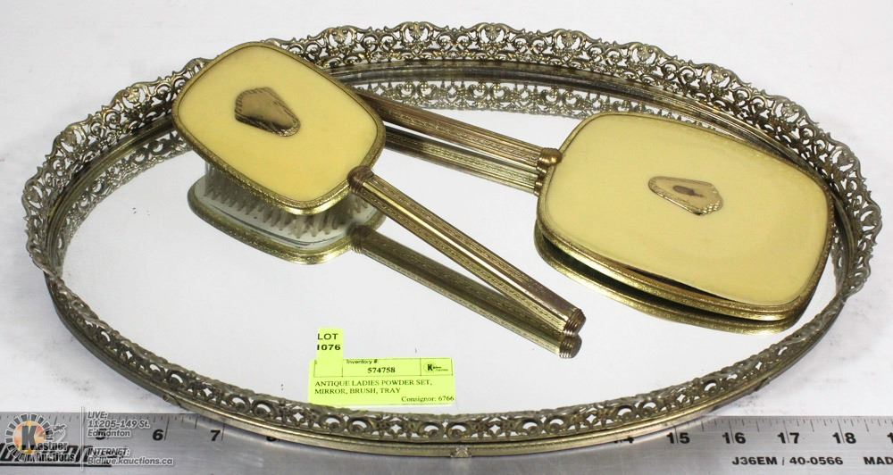 ANTIQUE LADIES POWDER SET, MIRROR, BRUSH, TRAY