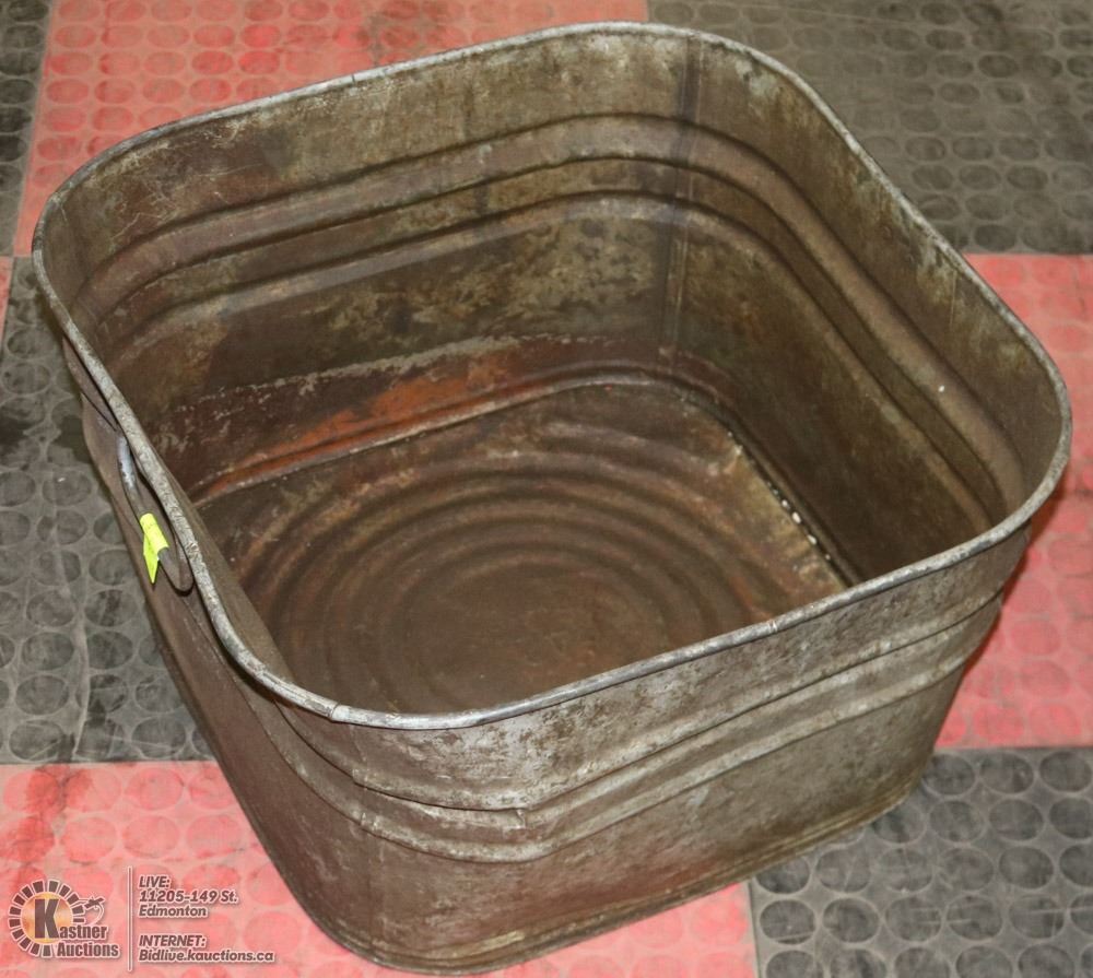 ANTIQUE METAL TUB WITH SIDE HANDLES.