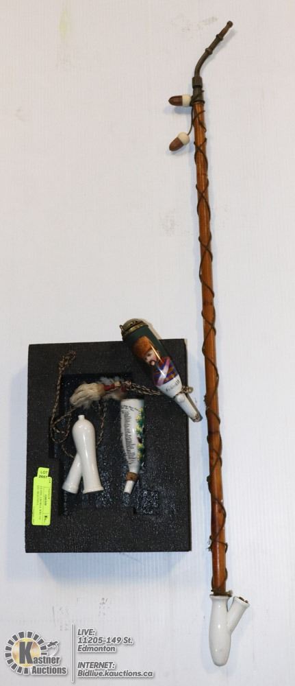 PIPE 38", 3 BOWLS, 2 HAND PAINTED, COMMEMORATING A GERMAN ARMY UNIT IN WW1. EACH MEMBERS NAME IS HANDWRITTEN ON ONE BOWL, THE OTHER IS A PAINTING OF FREDRICK VI OF DENMARK. - COLLECTIBLES