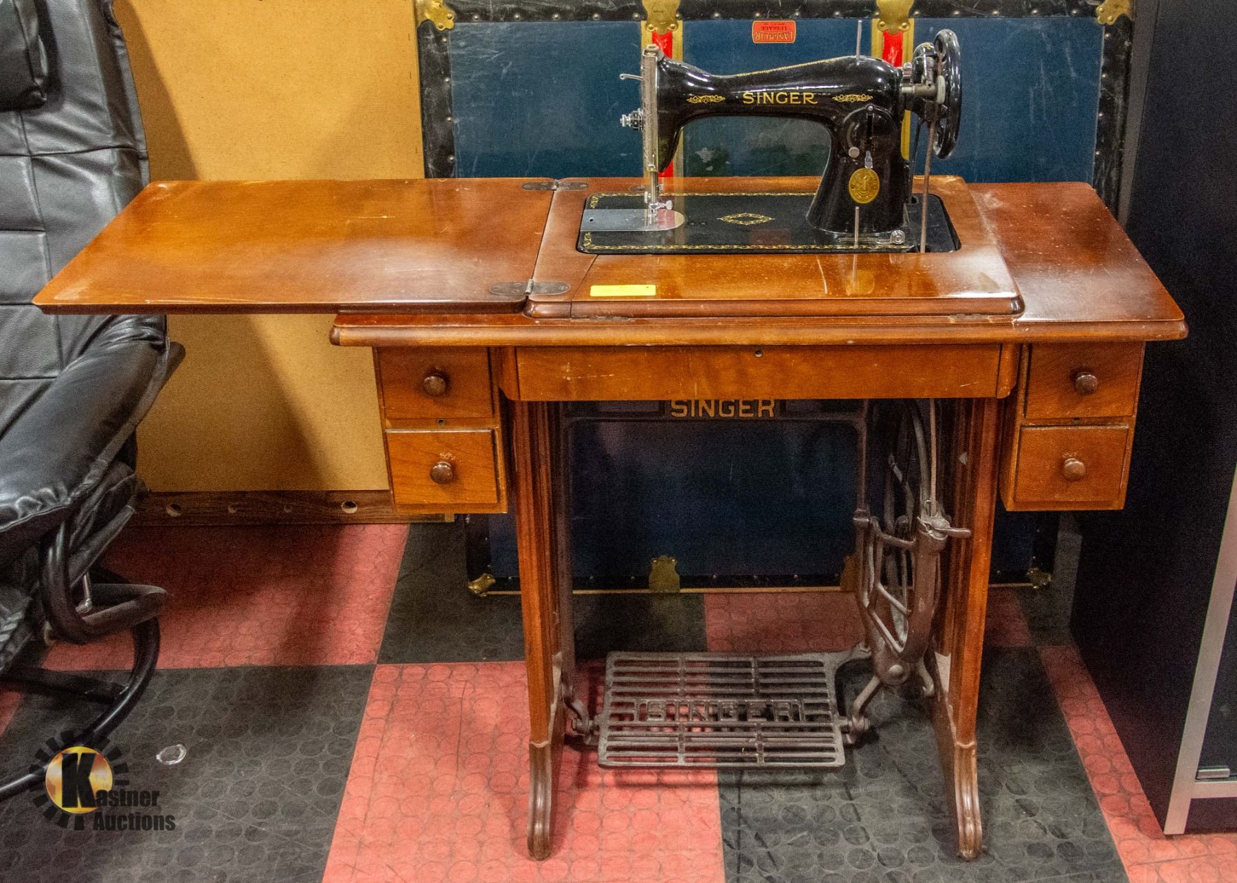 ANTIQUE SINGER TREADLE SEWING MACHINE IN CABINET