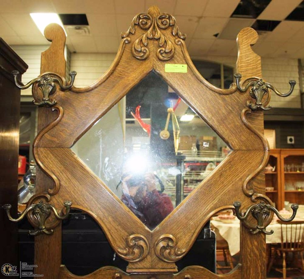ANTIQUE SOLID OAK HALL TREE 27"X16"X70"HIGH