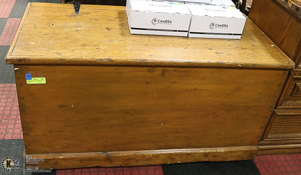 ANTIQUE SOLID WOOD TRUNK ON WHEELS